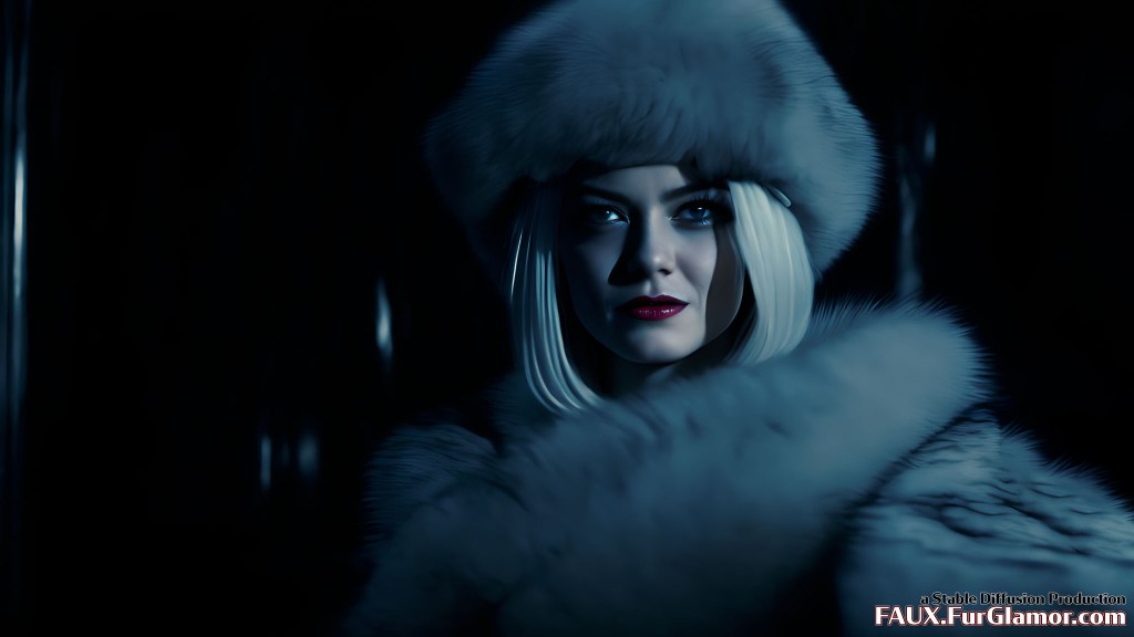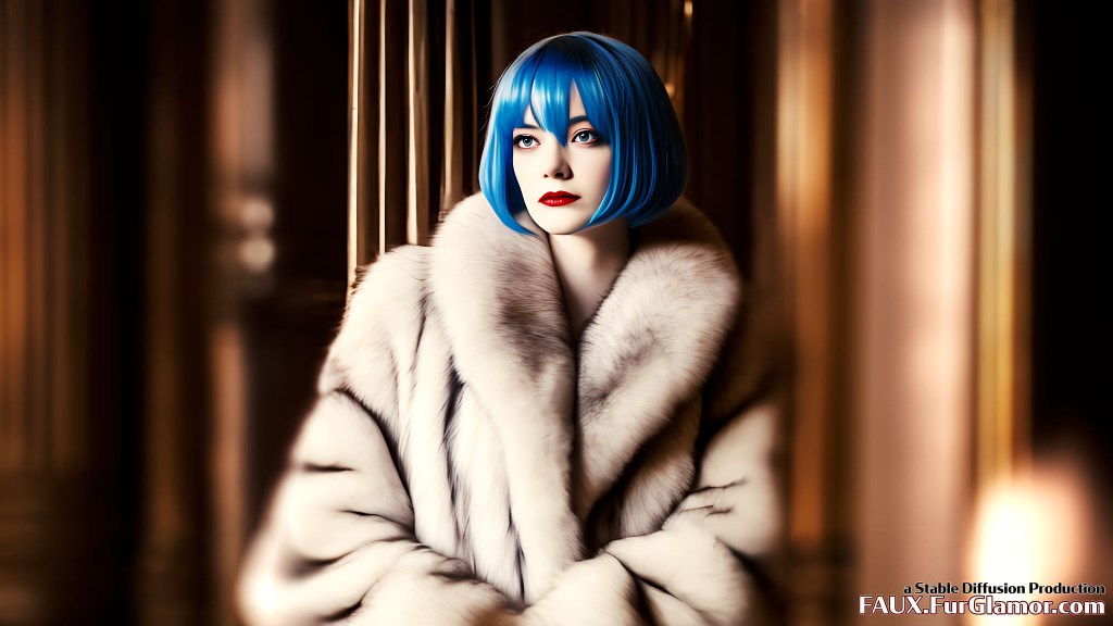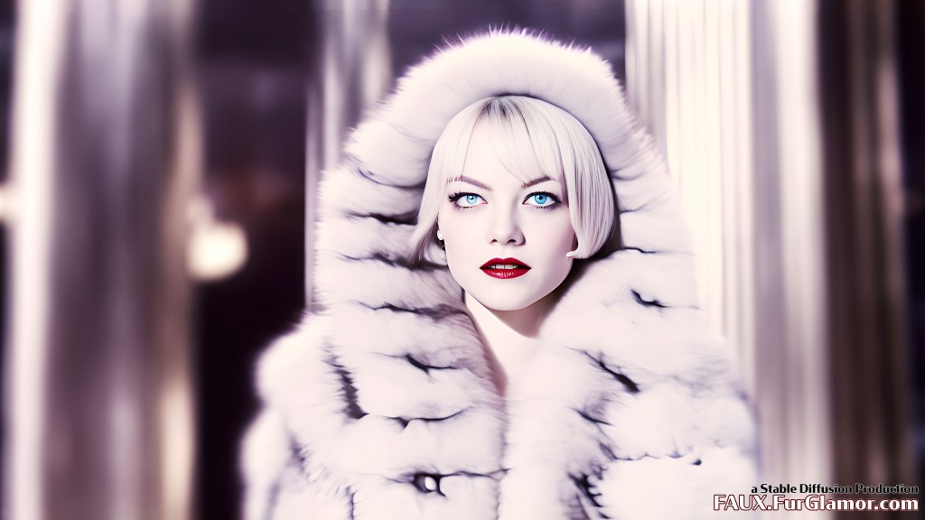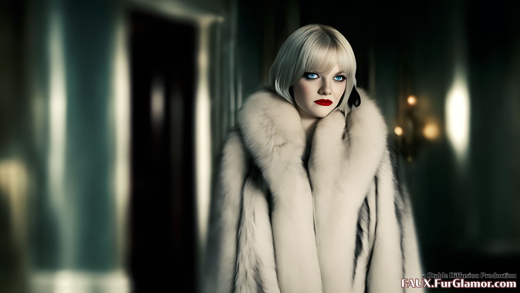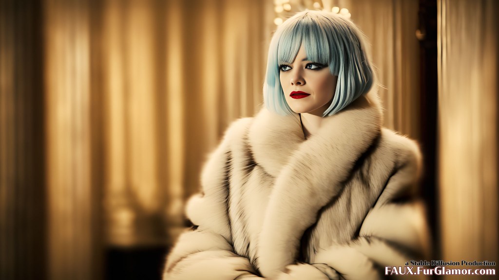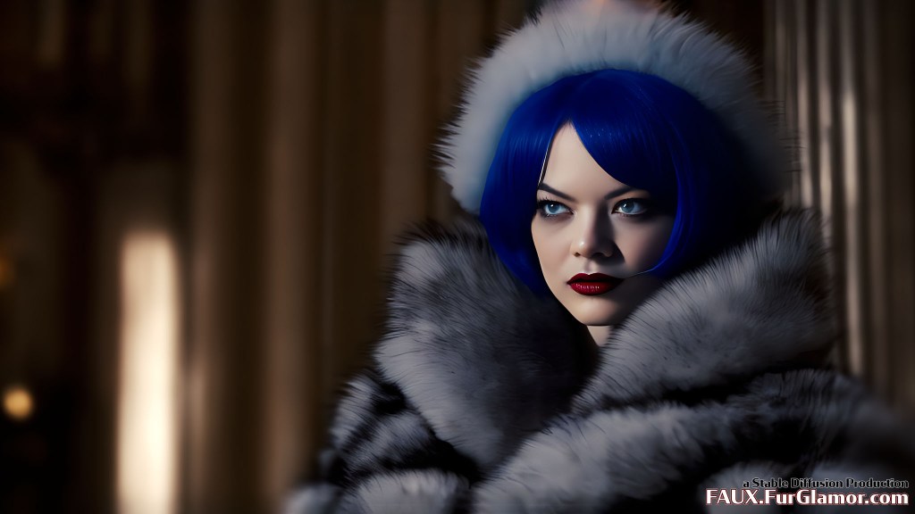 Emma Stone as Cruella De Vil wearing an enormous blue fox fur coat on a movie set, (Cruella 2021)+, pale skin, two tone black and white hair color, moody movie scene, harsh lighting, glamor, fashion, annoyed look, 4k, hdr,