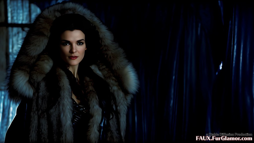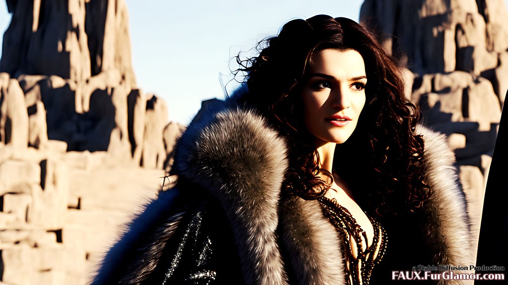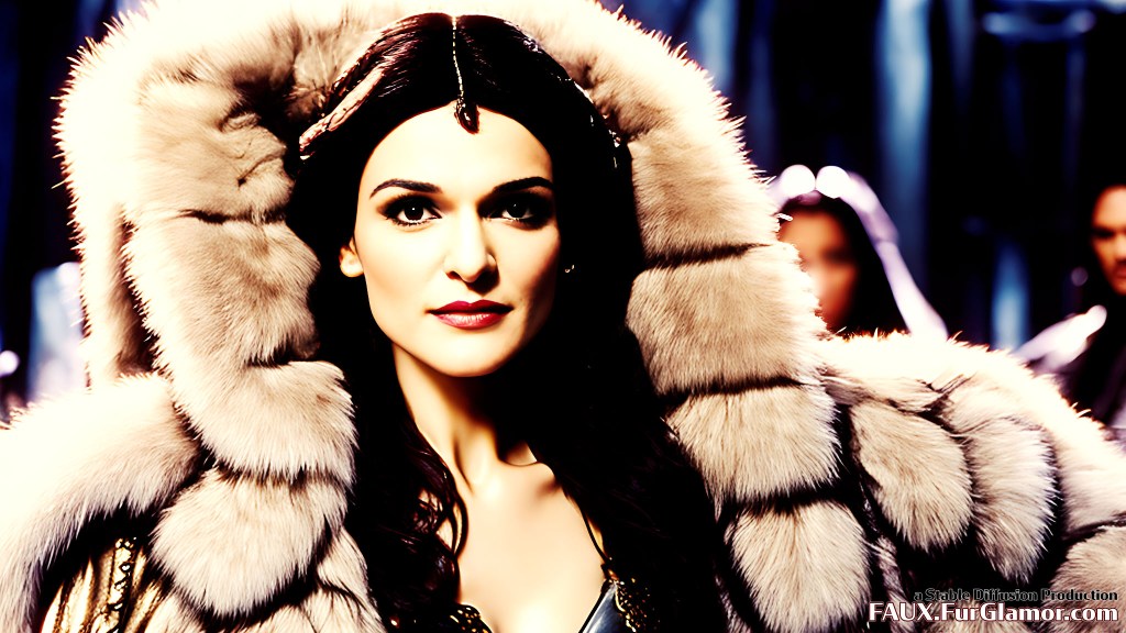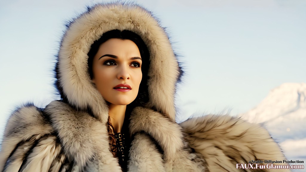 Rachel Weisz wearing a large fur parka (The Mummy Returns 2001)+, blue fox fur coat, winter, professional photograph, 35mm, sharp, leather corset, steampunk, natural light, heavy eyeliner, bouffant++, black hair