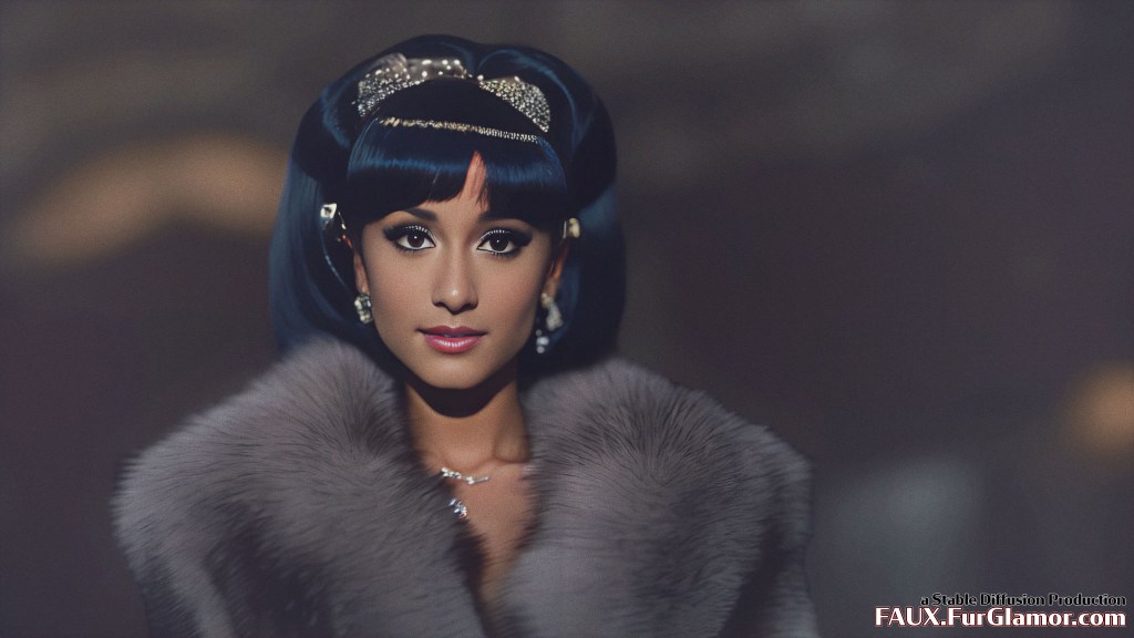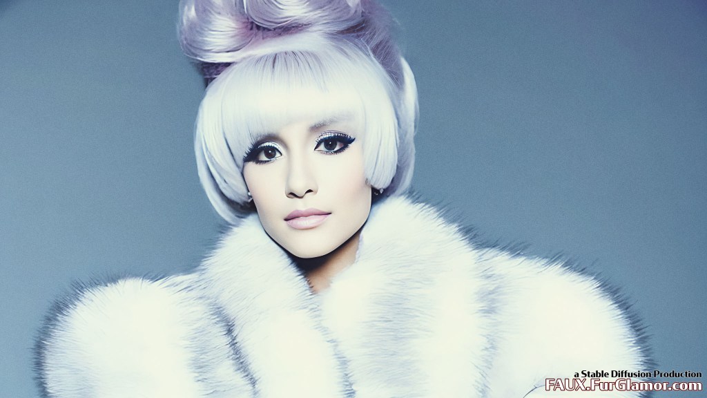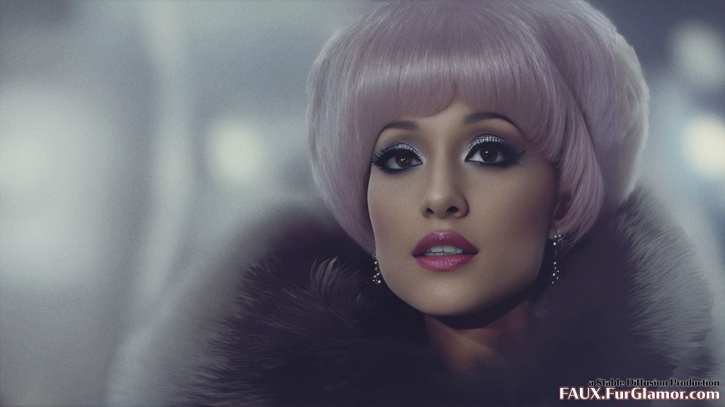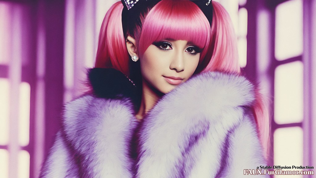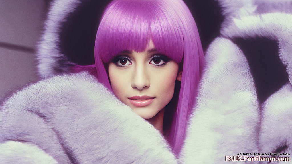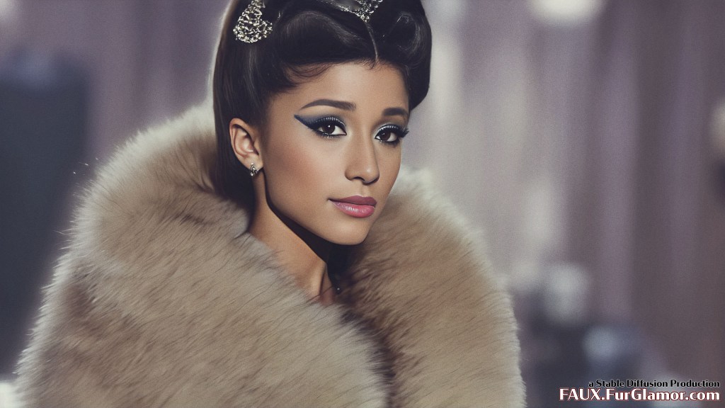 Ariana Grande as the character Jem wearing a blue fox fur coat on stage, from the TV show Jem and the Holograms, 35mm, sharp, realistic portrait, highly detailed, symmetrical features, (big bouffant hair)++, 1980s music video, (thick eyeliner)+