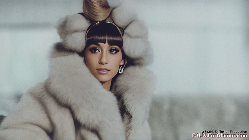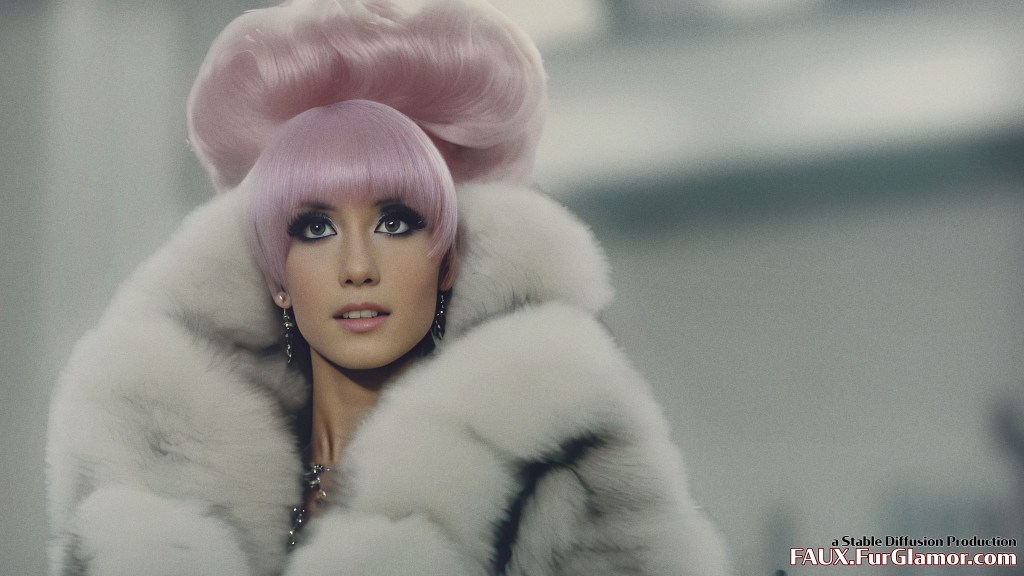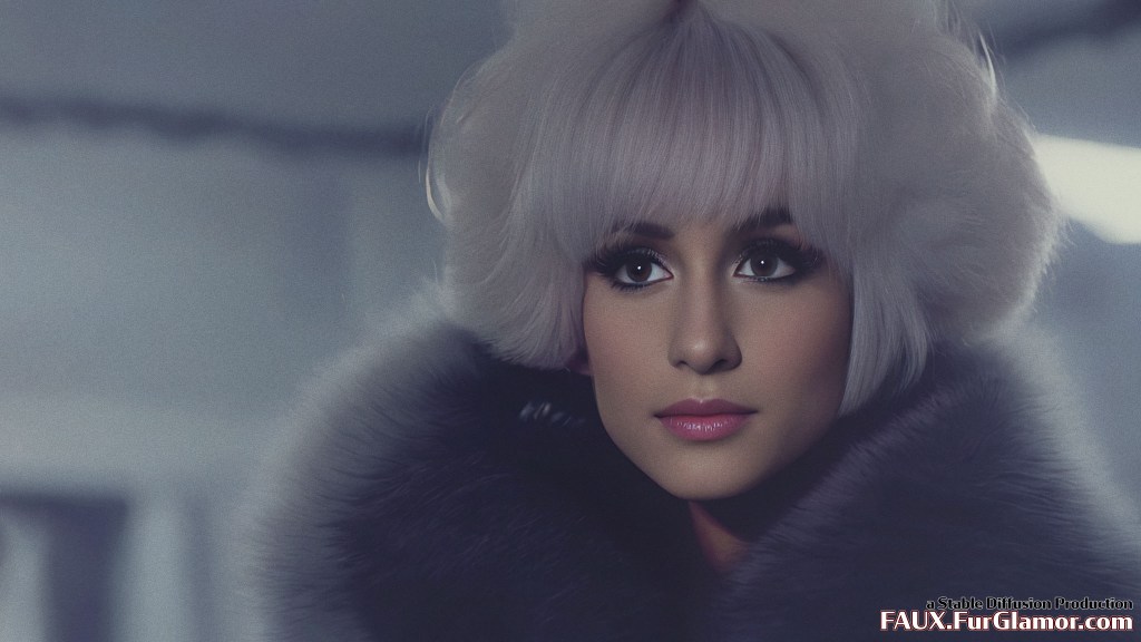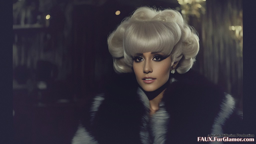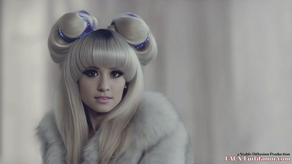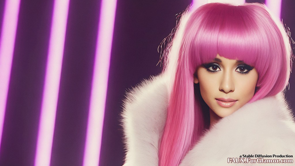 Ariana Grande as the character Jem wearing a blue fox fur coat on stage, from the TV show Jem and the Holograms, 35mm, sharp, realistic portrait, highly detailed, symmetrical features, (big bouffant hair)++, 1980s music video, (thick eyeliner)+