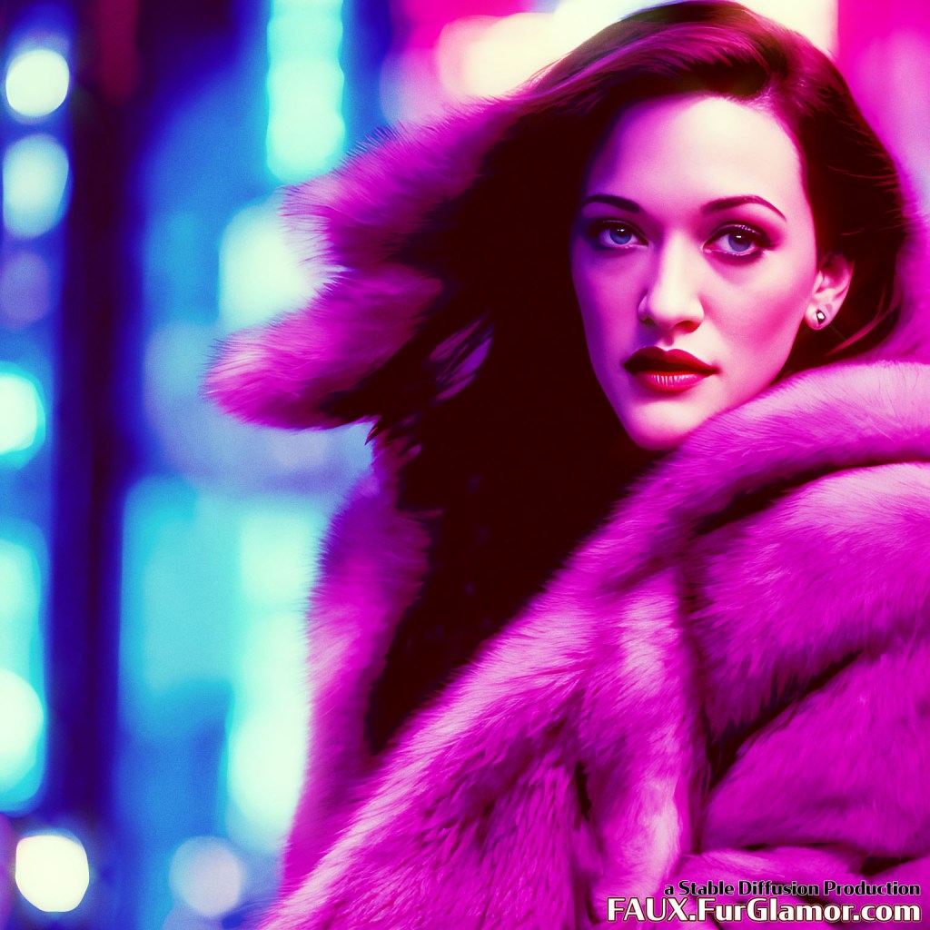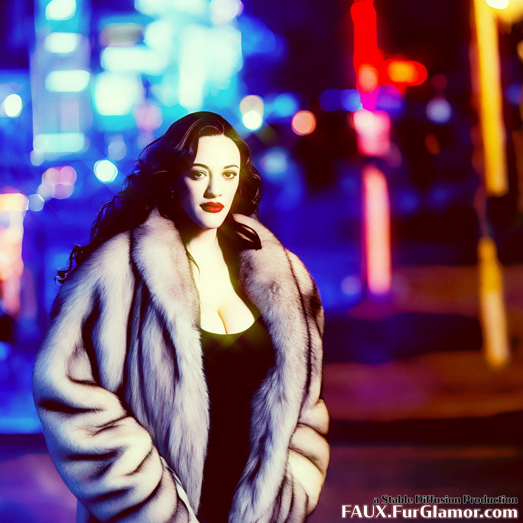 portrait of Kat Dennings on a city street at night, wearing a blue fox fur coat, (big hair)+, 85mm, f/1.4, sharp, Nikon D850, (eyeliner)+, moody cinematic lighting, neon city lights, street photography, 8k