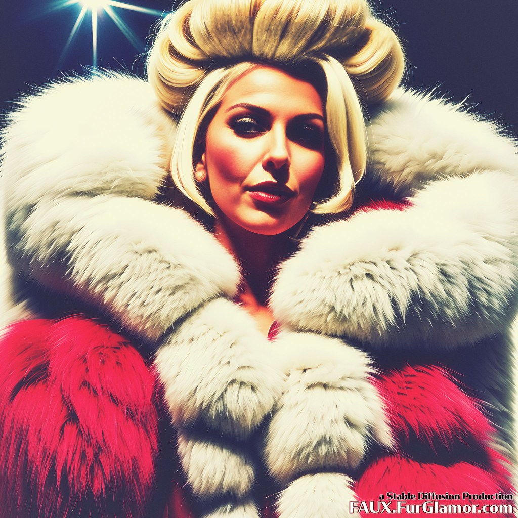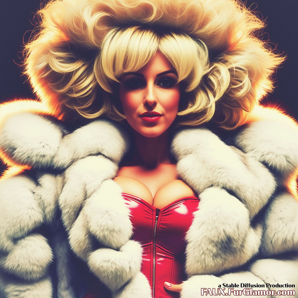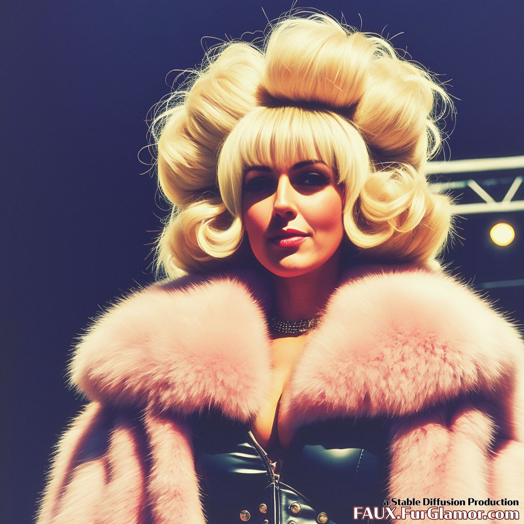 professional photo of Jessica Nigri in a (~color) (fur coat)+ over a studded leather corset, blonde mega (bouffant hair)++, huge fur collar, inside, low angle shot, high detailed skin, 8k uhd, dslr, concert lighting, backlighting, exhaling creamy smoke, high quality, film grain, Fujifilm XT3,