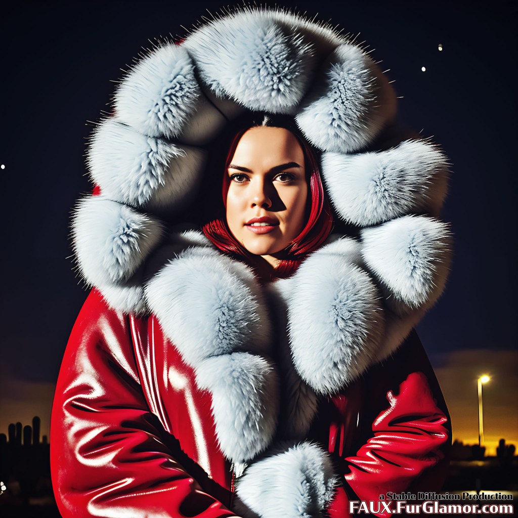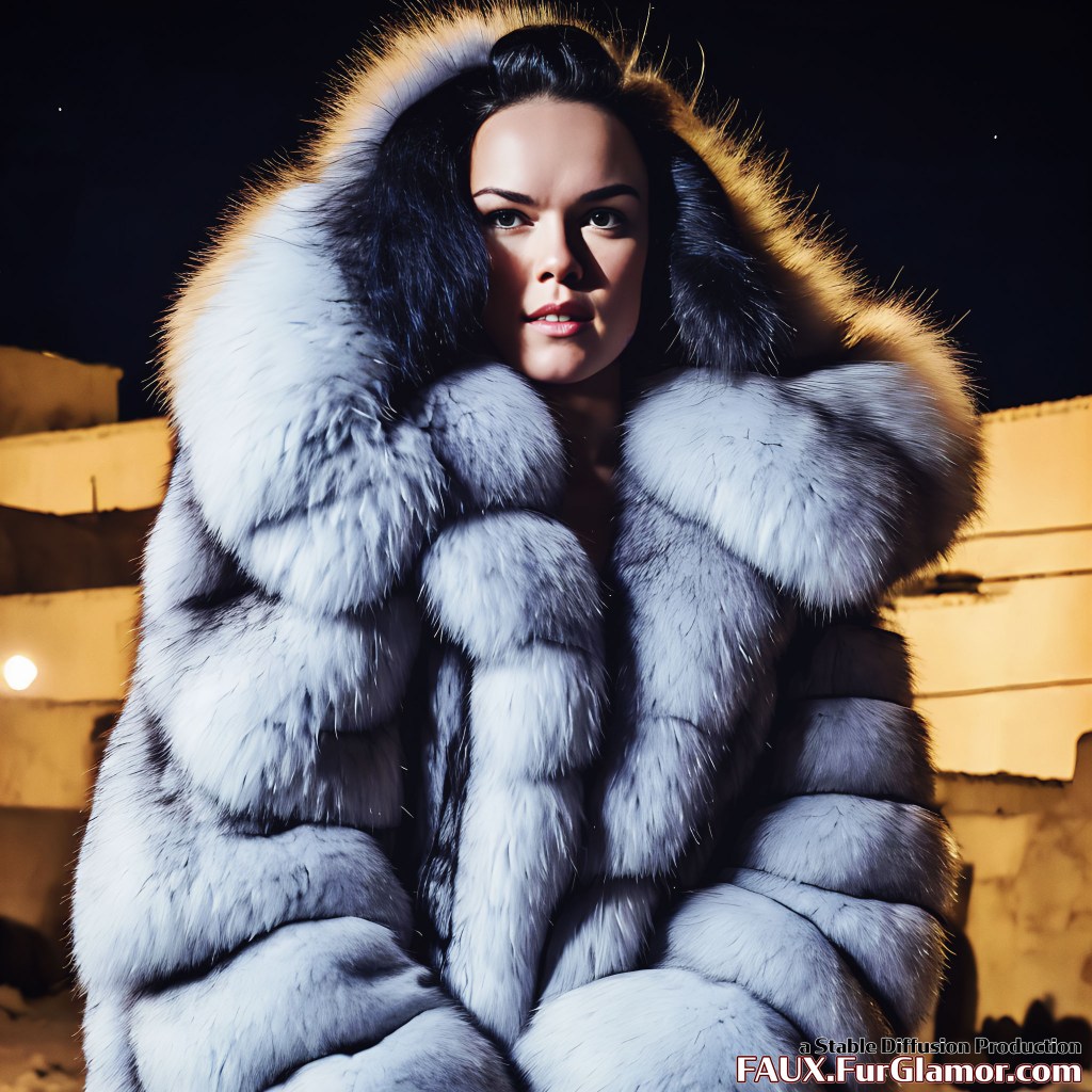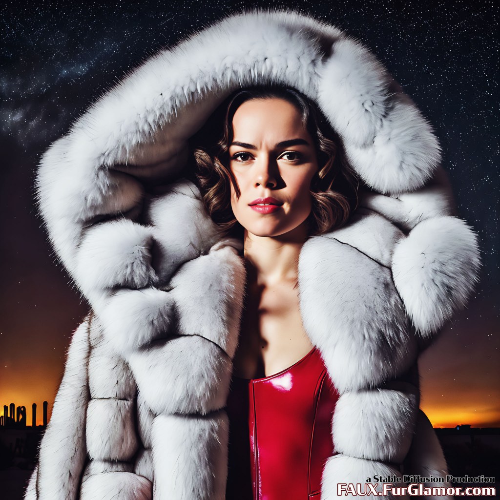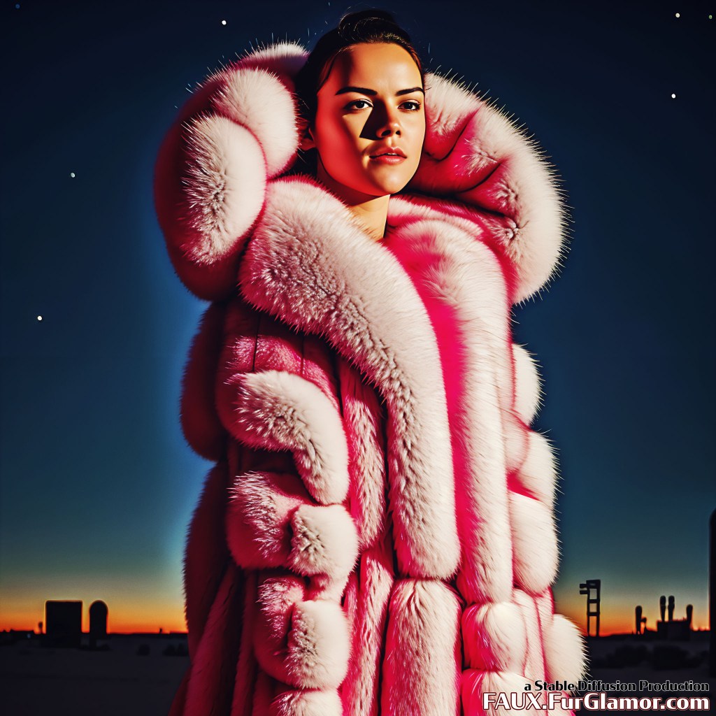 RAW photo, analog style medium shot, dark jedi Daisy Ridley in a (pink and white) fur coat, latex bodysuit, mega (bouffant hair)+, high detailed skin, 8k uhd, dslr, (desert city)+, (at night)+, (street lighting)+, steam, (snow)+, (starry sky)+, (flying cars)+, high quality, film grain, Fujifilm XT3, sfw,