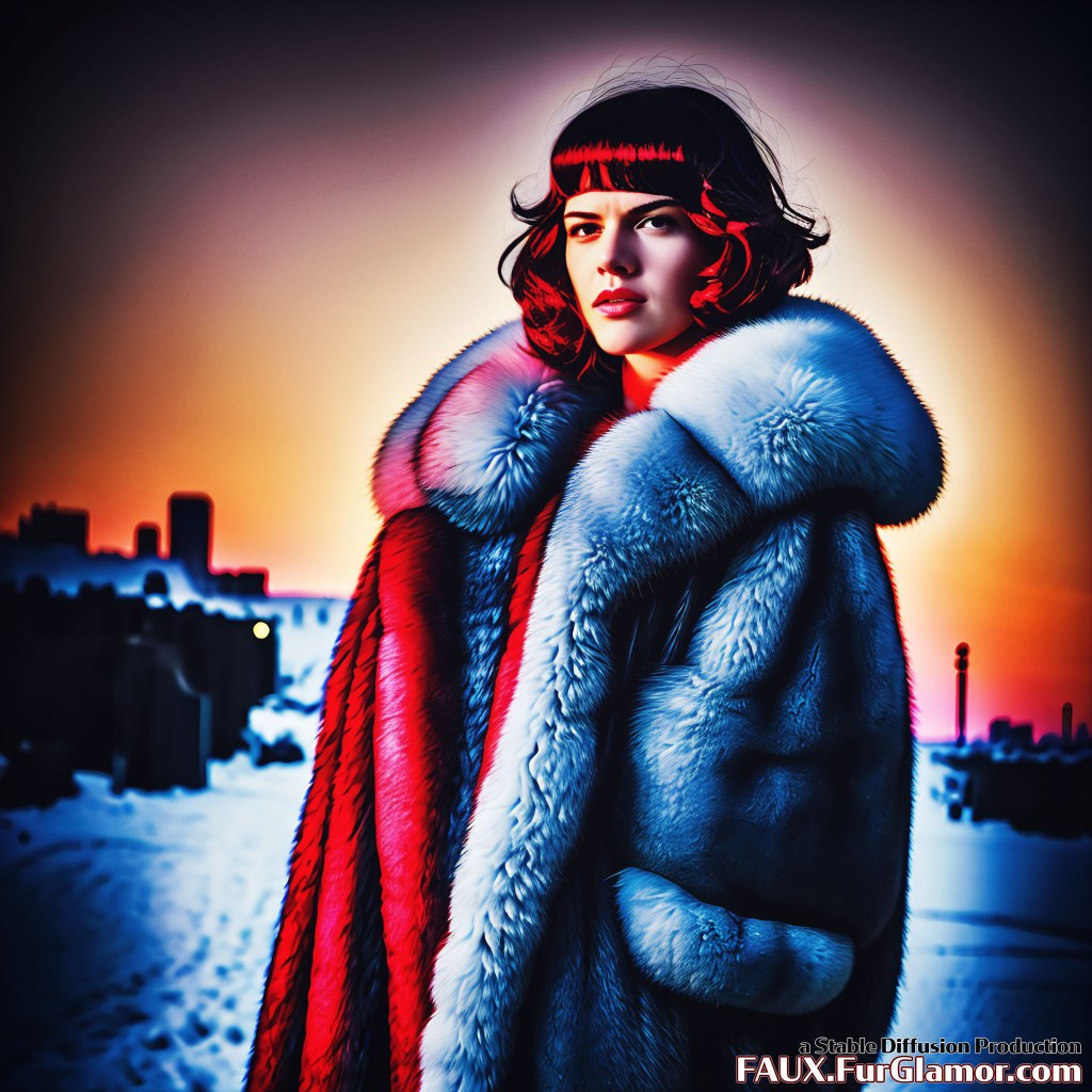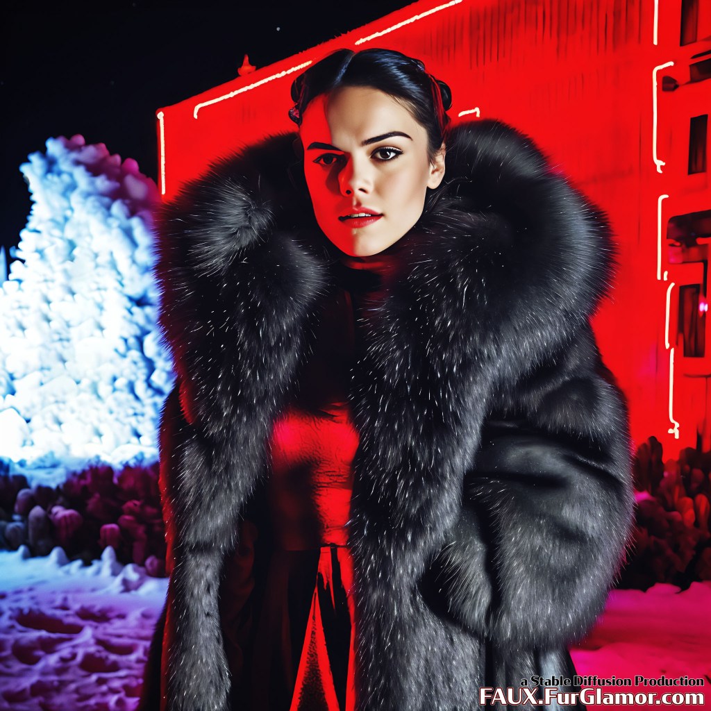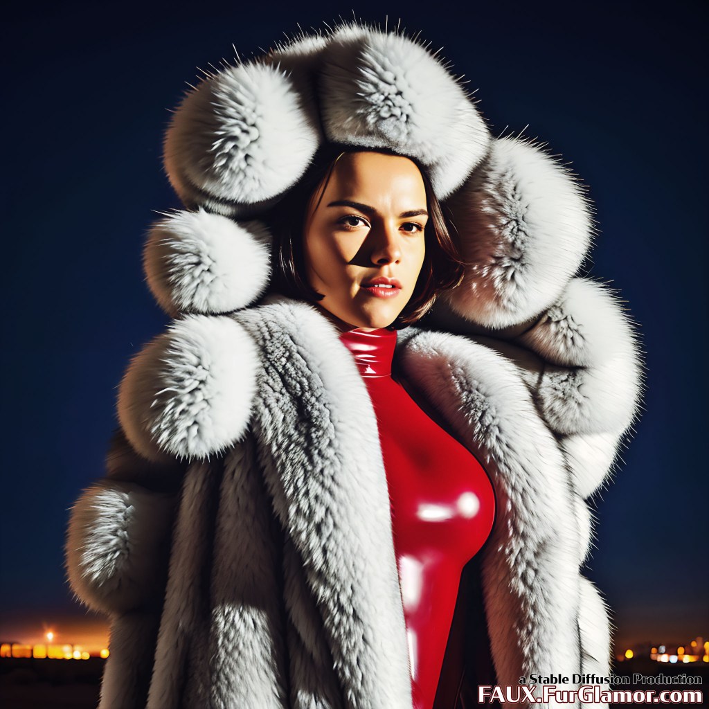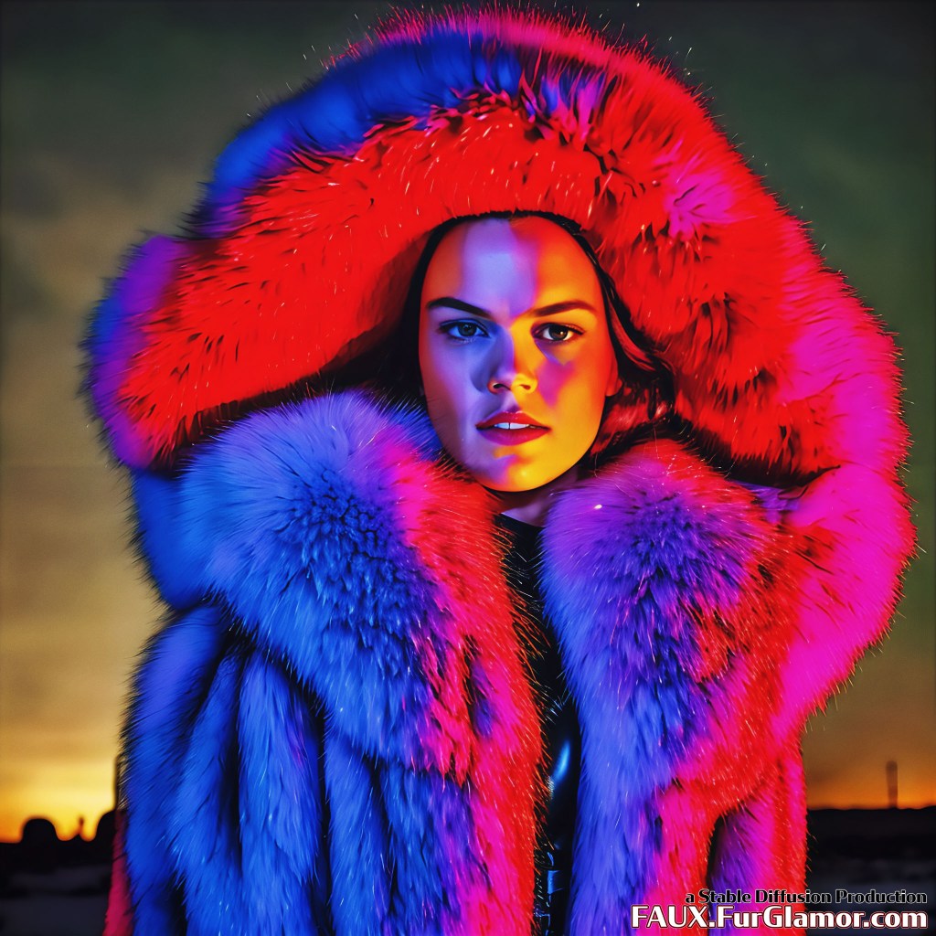 RAW photo, analog style medium shot, dark jedi Daisy Ridley in a (pink and white) fur coat, latex bodysuit, mega (bouffant hair)+, high detailed skin, 8k uhd, dslr, (desert city)+, (at night)+, (street lighting)+, steam, (snow)+, (starry sky)+, (flying cars)+, high quality, film grain, Fujifilm XT3, sfw,