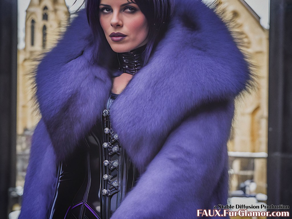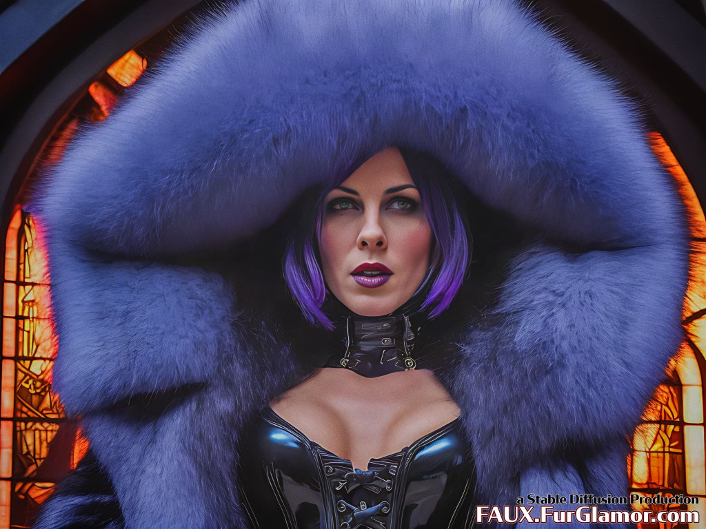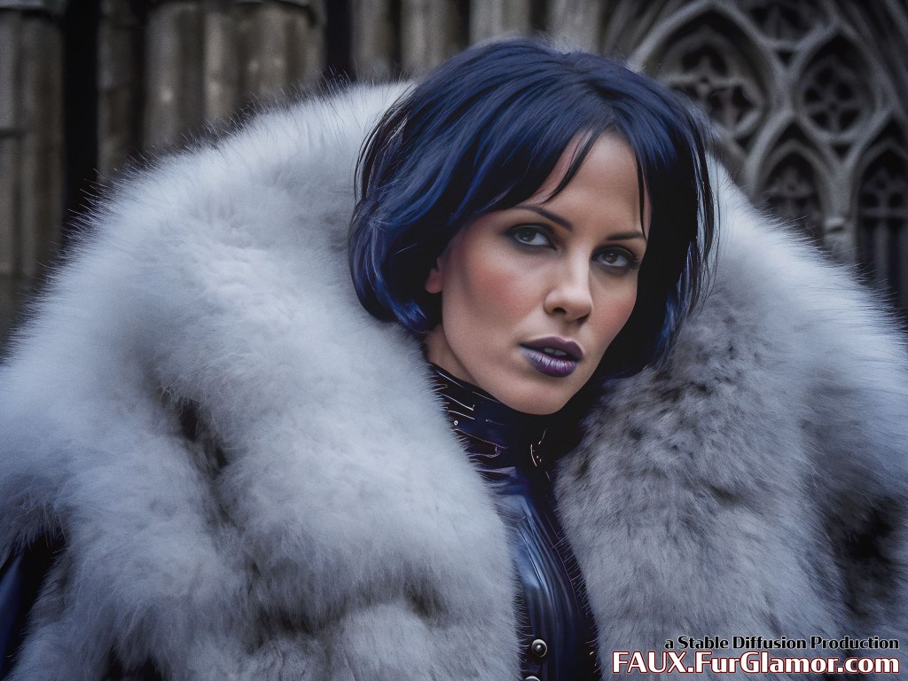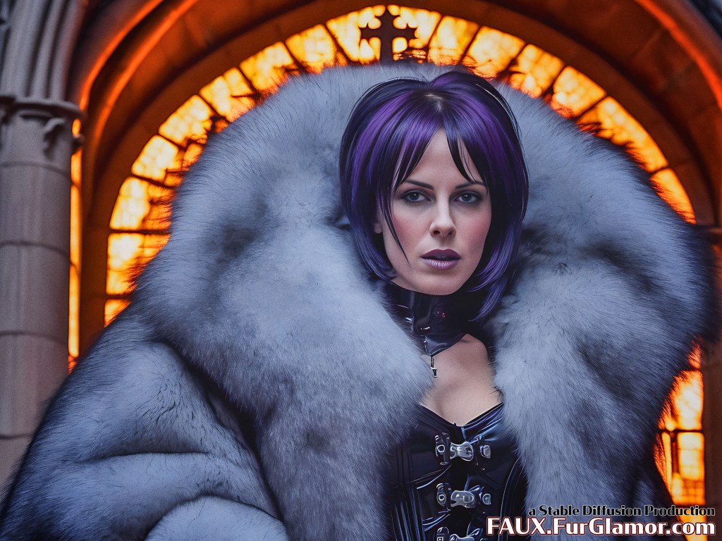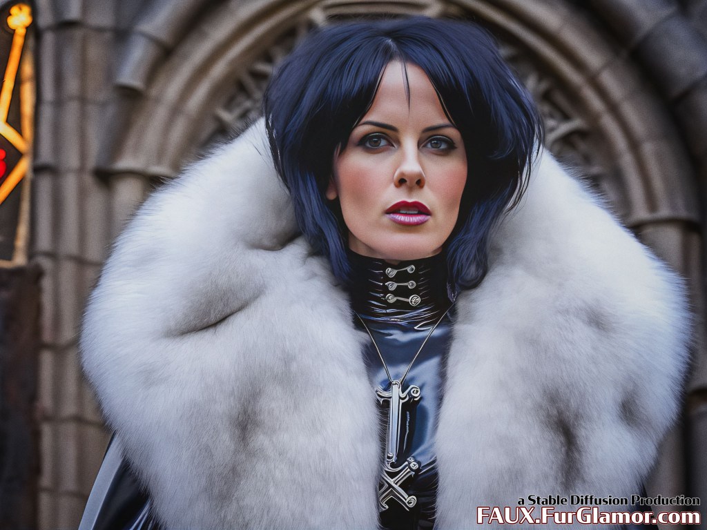 professional medium shot photo of goth punk, (crimson and black) fur coat (high fur collar)1.1, showgirl outfit, black (bouffant hair)1.15, looking at camera, standing, (gothic church)1.25, (at night)1.16, moody lighting, shallow DOF, rule of thirds, sharp focus, 35mm, 8K, highly-detailed, film grain, skin pores, (high detailed skin)1.1, 8k uhd, dslr, high quality, Fujifilm XT3, single shot, shoulder level shot, kate beckinsale,