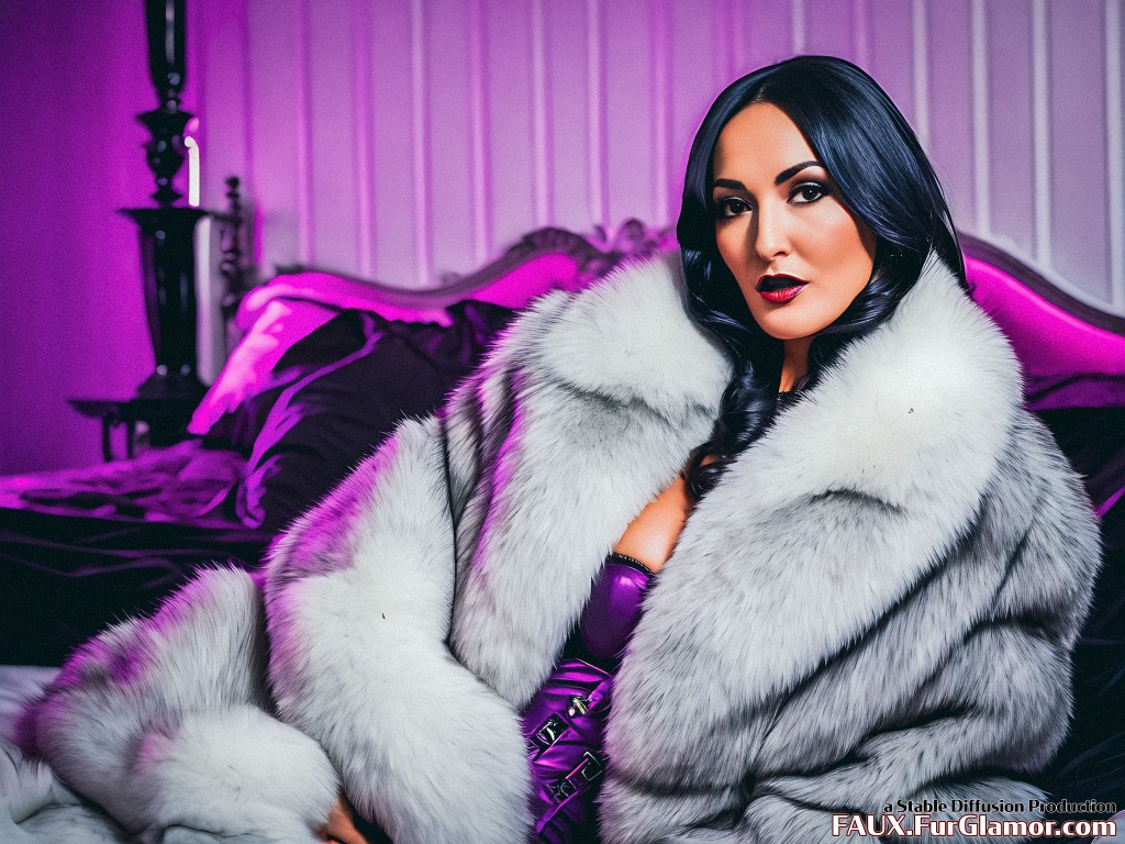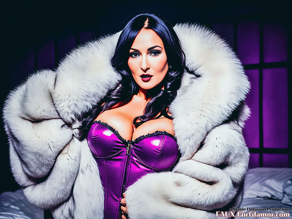 modelshoot style photo of (goth)++ Monica Bellucci in a bedroom with purple walls, wearing a blue fox fur coat, 100mm, sharp, analog, slight skin texture, sexy natural lighting, sultry, annoyed expression, latex corset, boots