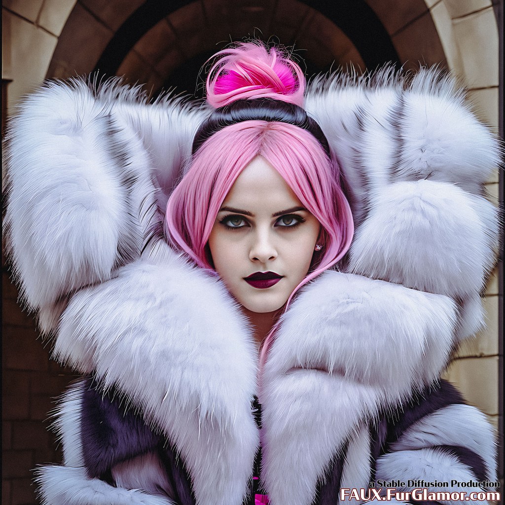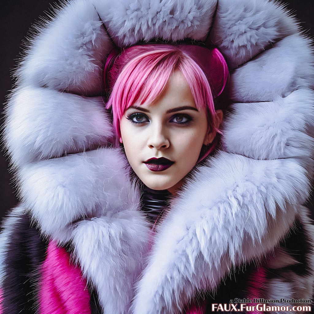 (goth)+ punk Emma Watson in a (pink striped)+ fur coat, latex corset, (bouffant hair)+, Professional Photo, Roadways, tunnels, Cybergoth Style, shallow depth of field, diffused soft lighting, [reflections]—, [hard lighting]—, Leica SL (Typ 601) Mirrorless Digital Camera, 90mm macro lens, f/11 aperture, ((best quality)), ((masterpiece)), ((realistic)), sharp, ultra detailed, UHD, 8k, bright colors
