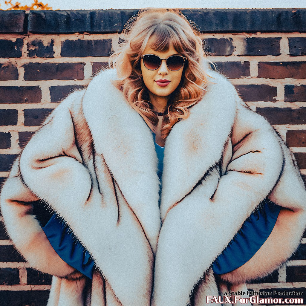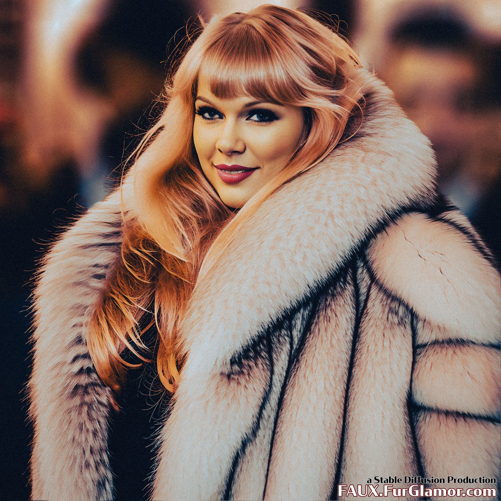 modelshoot style 1980s (Taylor Swift)+, wearing a bffc, on stage at a concert, 80s hair, (big hair)++, glam rock, (glam makeup)+, blonde hair, 8k uhd, dslr, vivid, concert lighting, backlighting, film grain, Fujifilm XT3, film grain, light skin texture, (huge fur collar)+, skin-tight latex, god rays