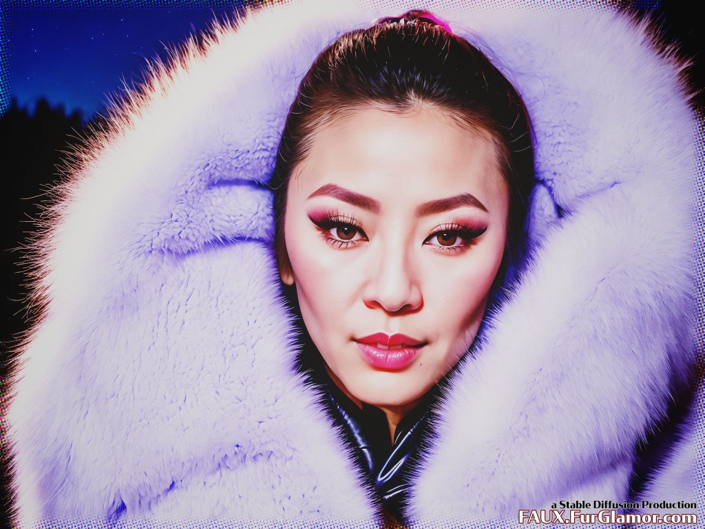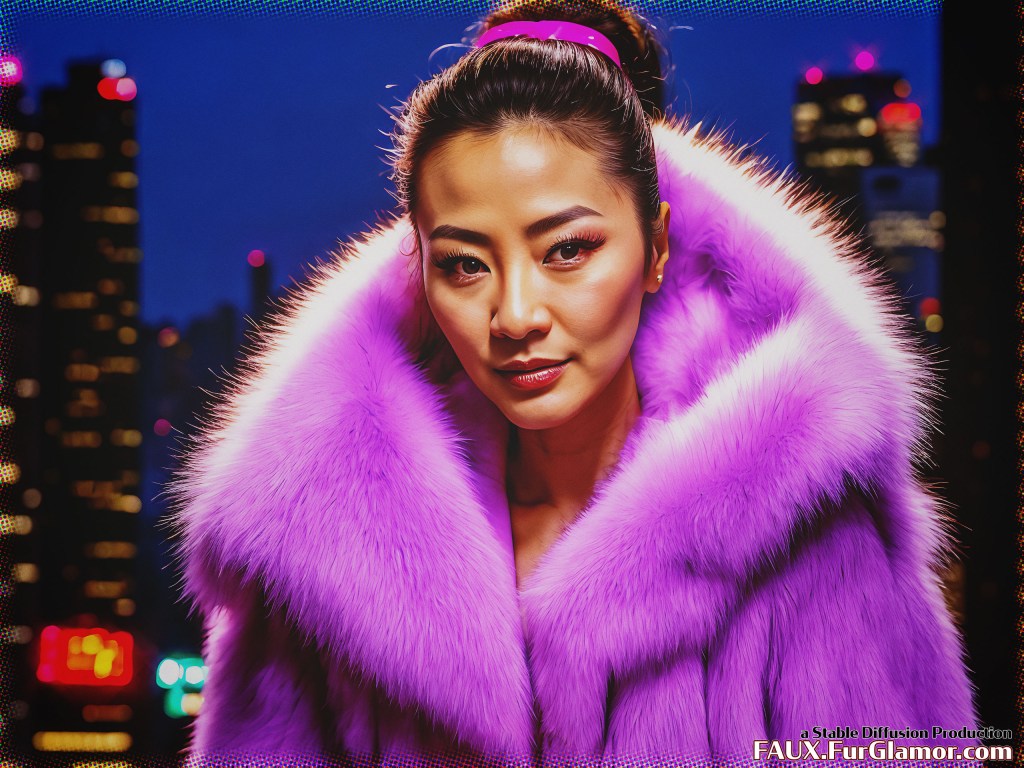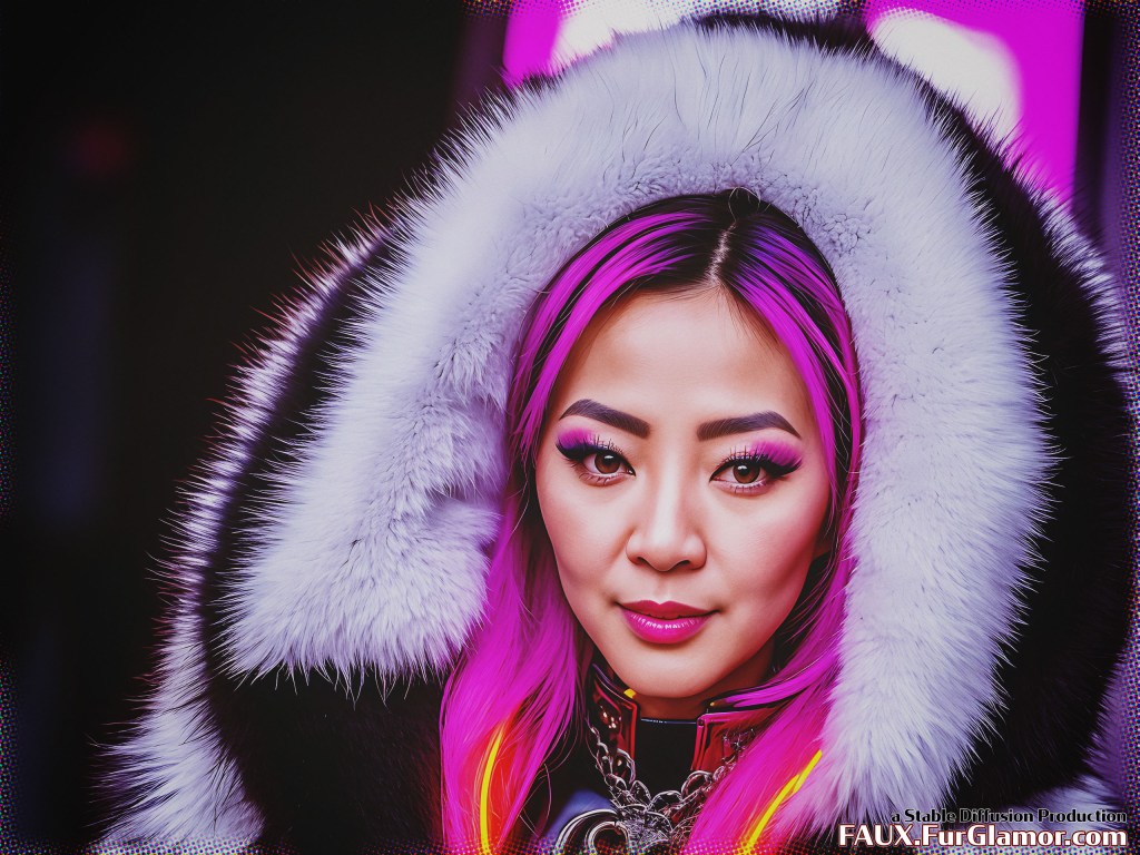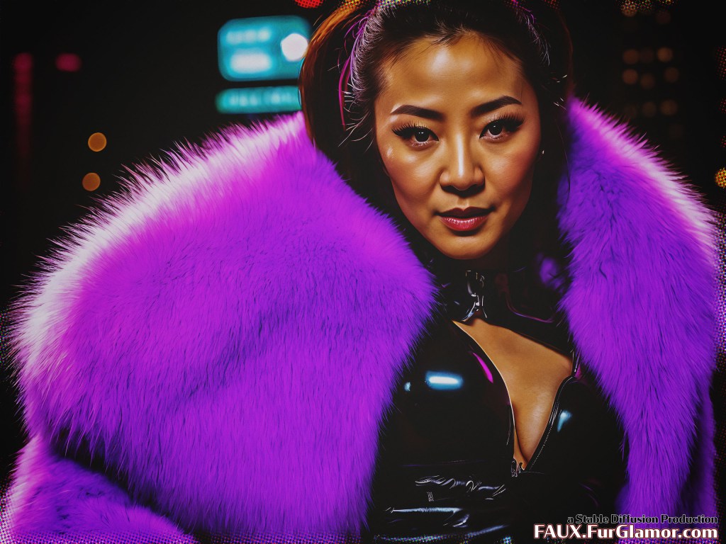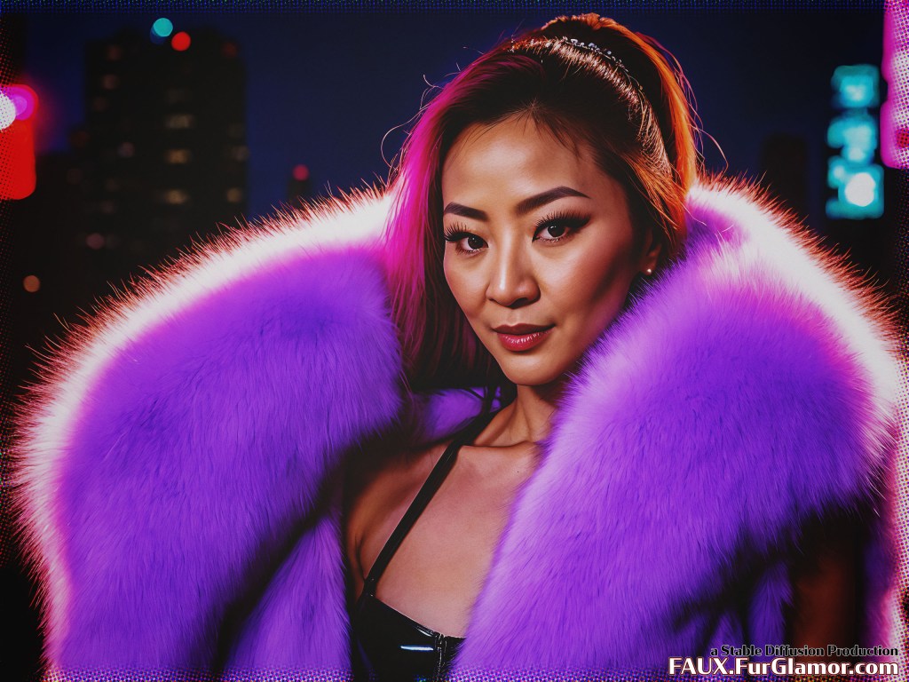 portrait of wearing a (fur coat)+, leather suit, corset, gloves, in a neon jungle, rain, night, city lights, cold, 85mm, sharp, (colorful makeup)+, bouffant hair, professional photograph, crisp lighting, vaporwave, detailed skin, skin pores, medium shot, shoulder level, single shot,