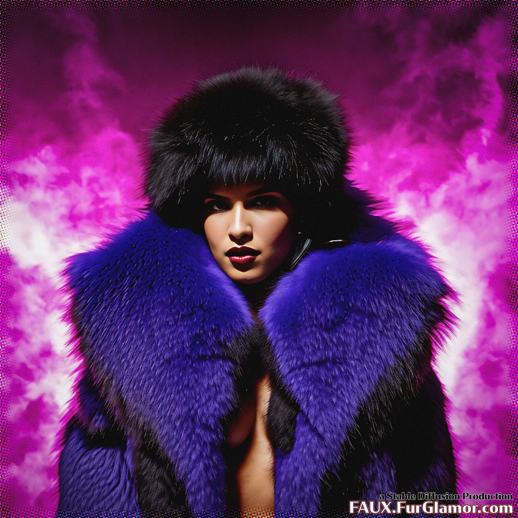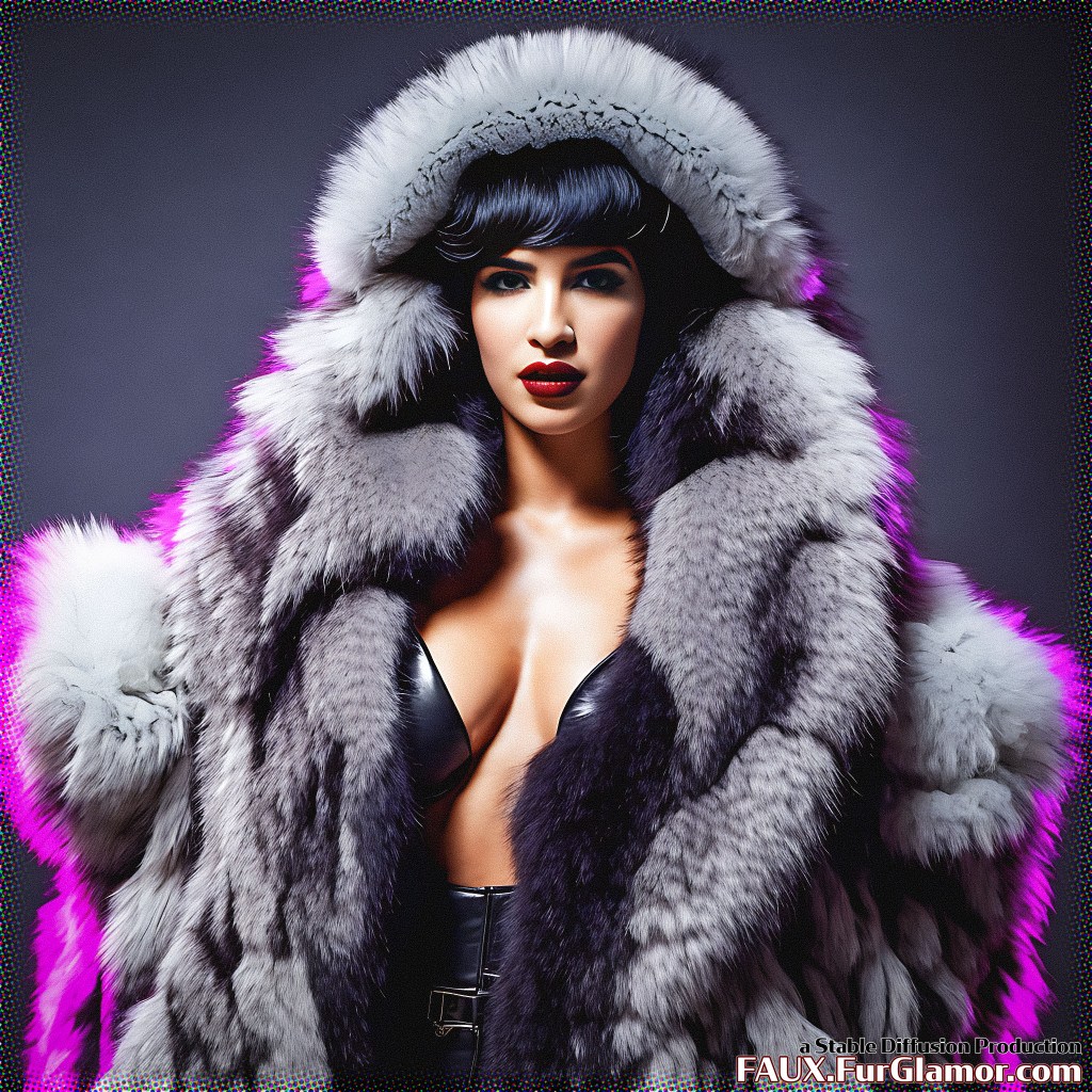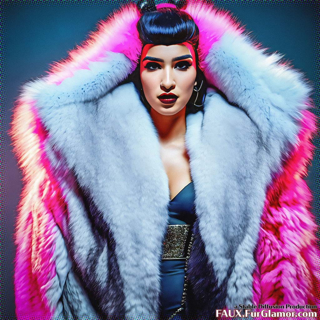 professional photo, cowboy shot, (goth)+ Dua Lipa wearing a huge hot pink and white (fur coat)+ over a (fetish)+ costume, (huge fur collar)++, high detailed skin, (heavy eyeliner)+, mega (bouffant hair)+, (cyberpunk concert)++, (post apocalyptic)++, 8k uhd, dslr, dramatic lighting, high quality, film grain, Fujifilm XT3,