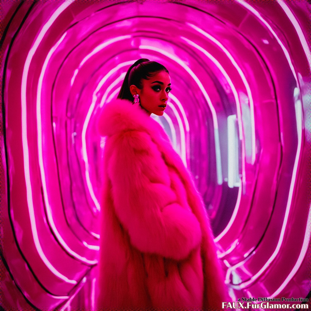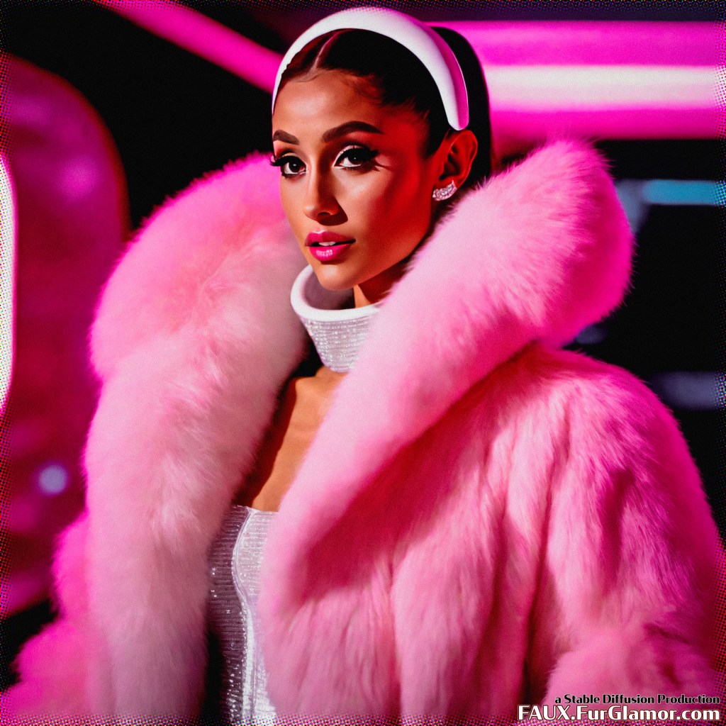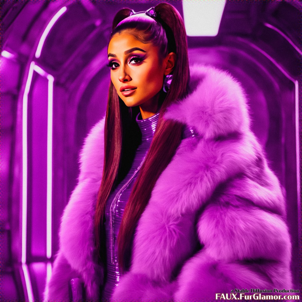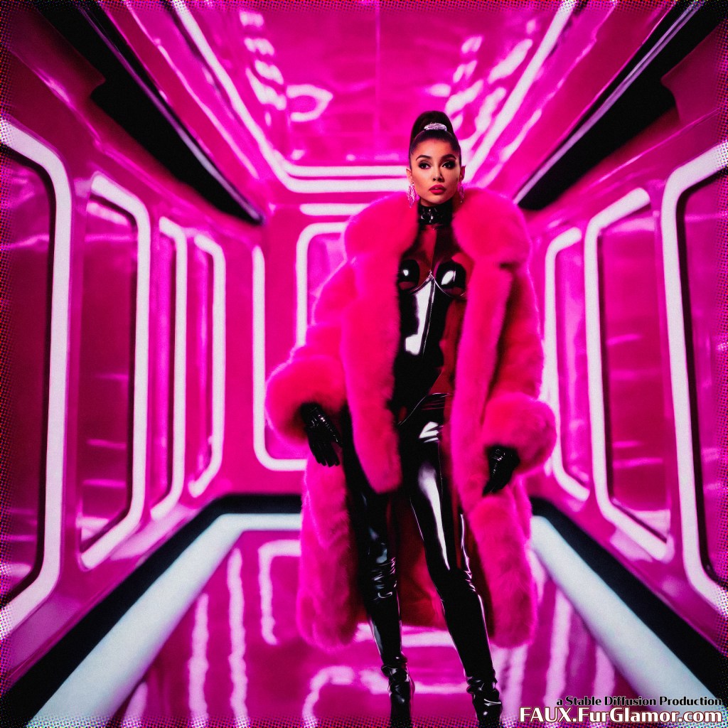 cinematic still of Ariana Grande wearing a bulky ~~color (fur coat)1.25, oversized fur coat with a huge rolling (fur collar)1.25 over a skin-tight shiny pvc bodysuit and gloves, (from the film 2001 A Space Odyssey)1.5, 60s scifi astronaut, detailed starship interior, (goth makeup, heavy eyeliner)1.1, bouffant hair, 35mm, sharp, digital movie still, technicolor, strong cinematic lighting, colorful, saturated, detailed skin, medium shot, shoulder level,