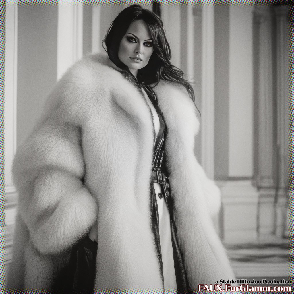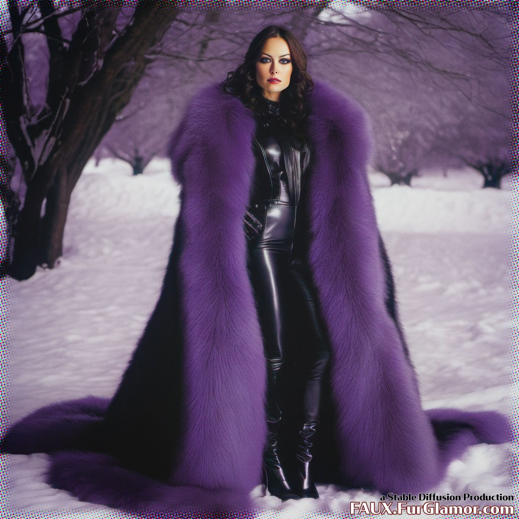 analog style, modelshoot style, professional RAW cowboy shot photograph of an enormous full-length ~~color fox (fur coat)1.13 with a high thick (fur collar)1.2, worn by (Olivia Wilde)1.15 as the character (Quorra)1.1 from the movie Tron Legacy, (heavy eyeliner, gothic makeup, short black hairstyle, pale skin)1.1, smoking, exhaling smooth white smoke from her lips, shiny latex bodysuit, highly detailed night city background, 35mm, moody cinematic lighting, detailed features, serious expression, detailed skin texture, intricate, high detail, dramatic, Fujifilm XT3, dominatrix