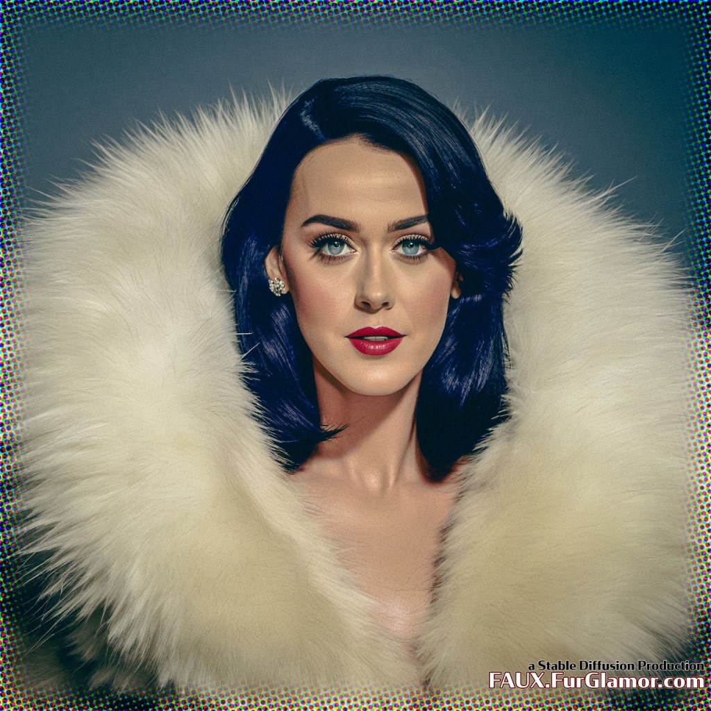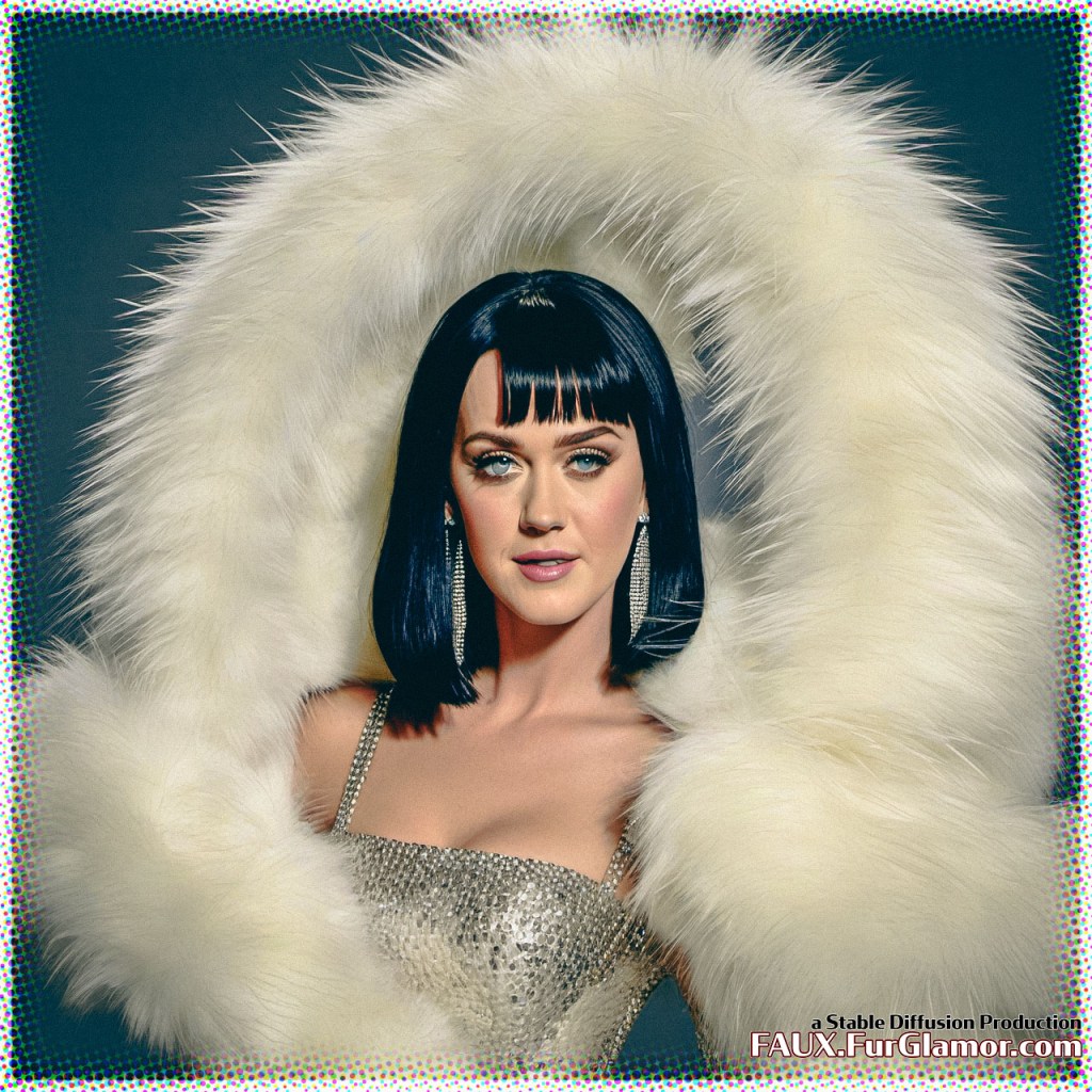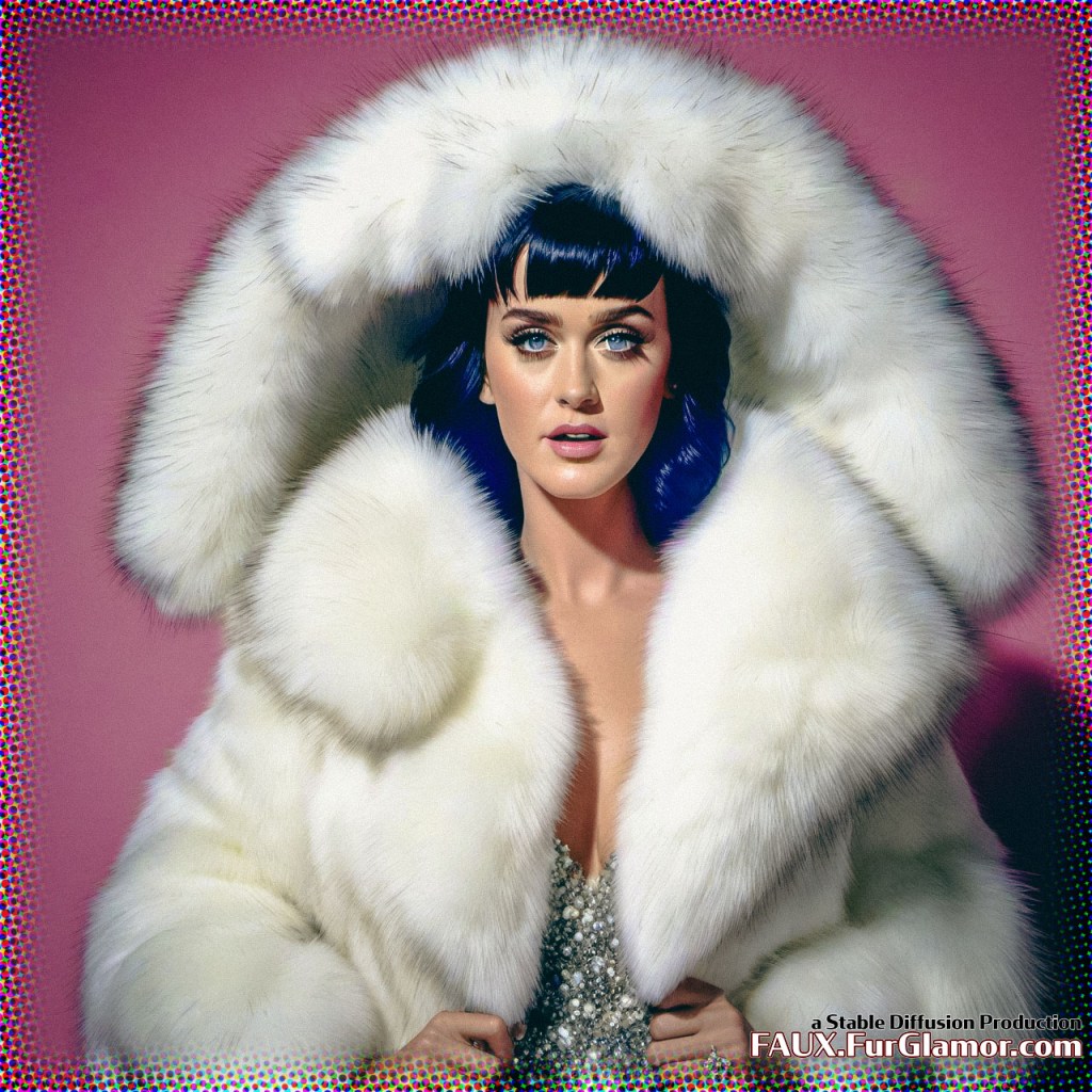 dynamic RAW upper body shot photograph of popstar Katy Perry, wearing a huge fox (fur coat)1.1 with a high and wide (fur collar)1.1, in a fur clothing store, 35mm, key light