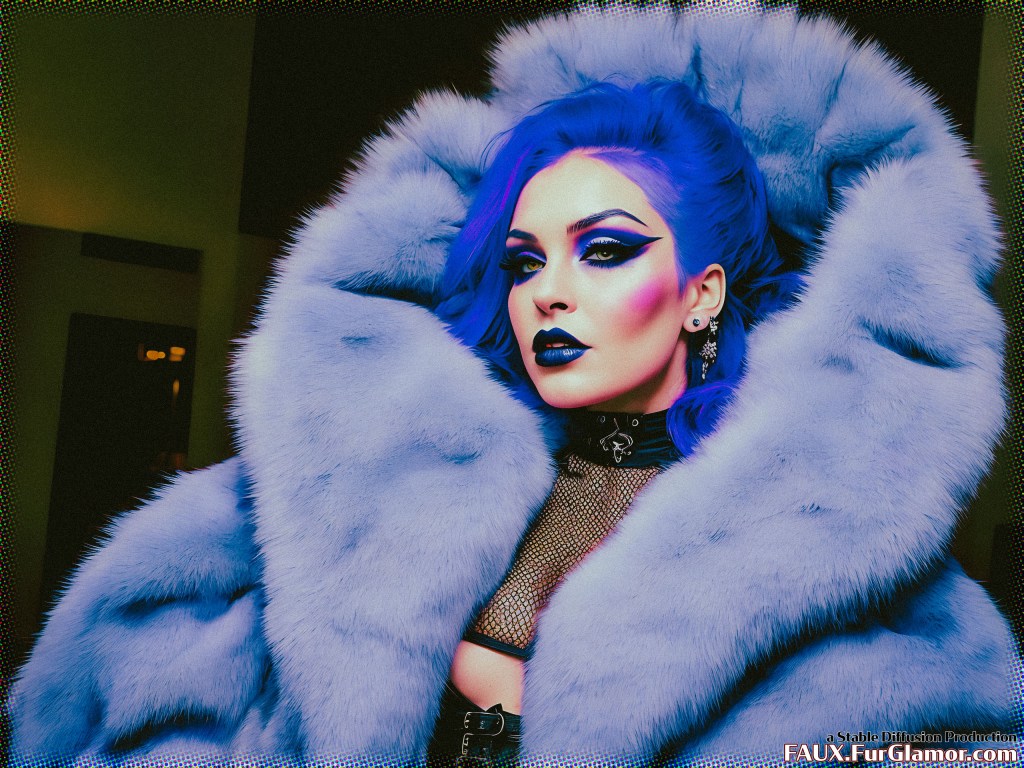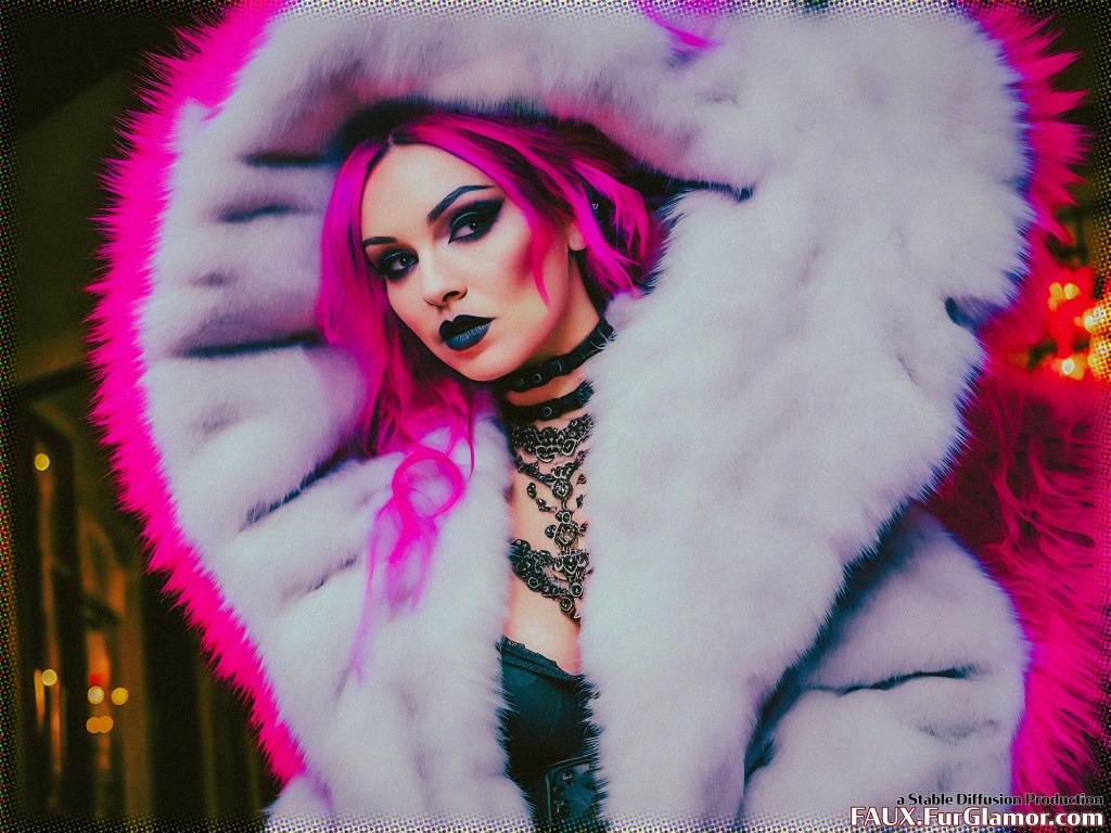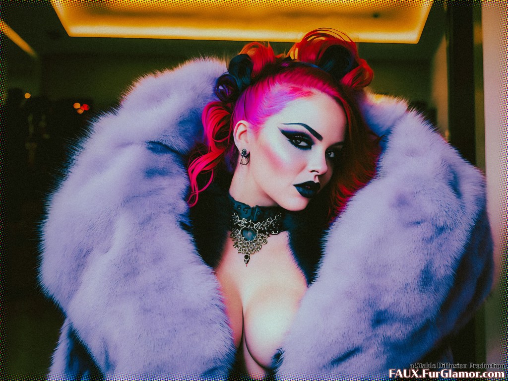 medium shot professional RAW color photograph of goth punk wearing a huge fluffy ~~COLOR (fur coat)1.21 over a corset, (bouffant hairstyle)1.15, (big fur collar)1.21, (heavy eyeliner, gothic makeup)1.15, fishnets, hotpants, detailed pale skin, heavy eyeliner, in a (gothic hotel)1.175, ambient light, smoke, high detail, sharp, UHD, 8k, bright colors, 90mm macro lens, f/11 aperture, (detailed skin)+, film grain, splatter, from the movie Lost in Translation, cowboy portrait, swf
