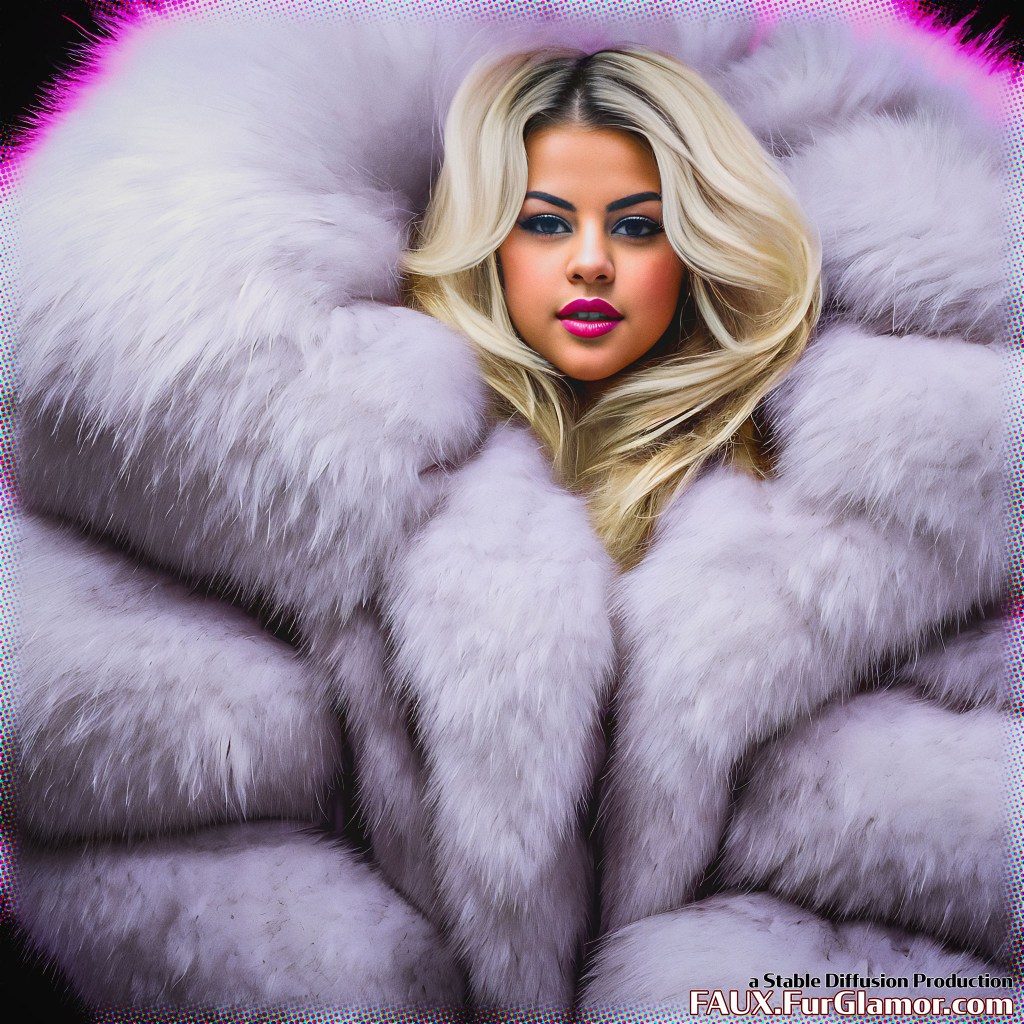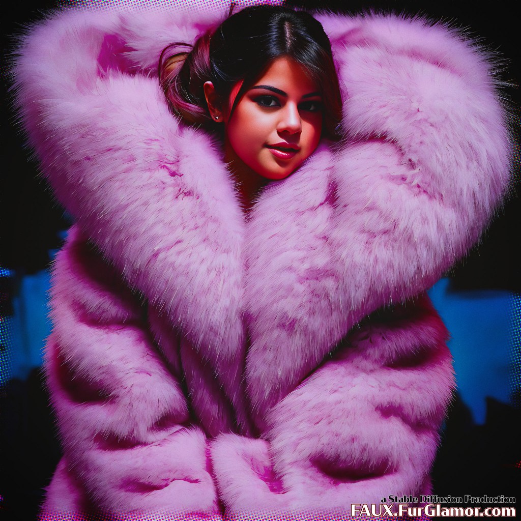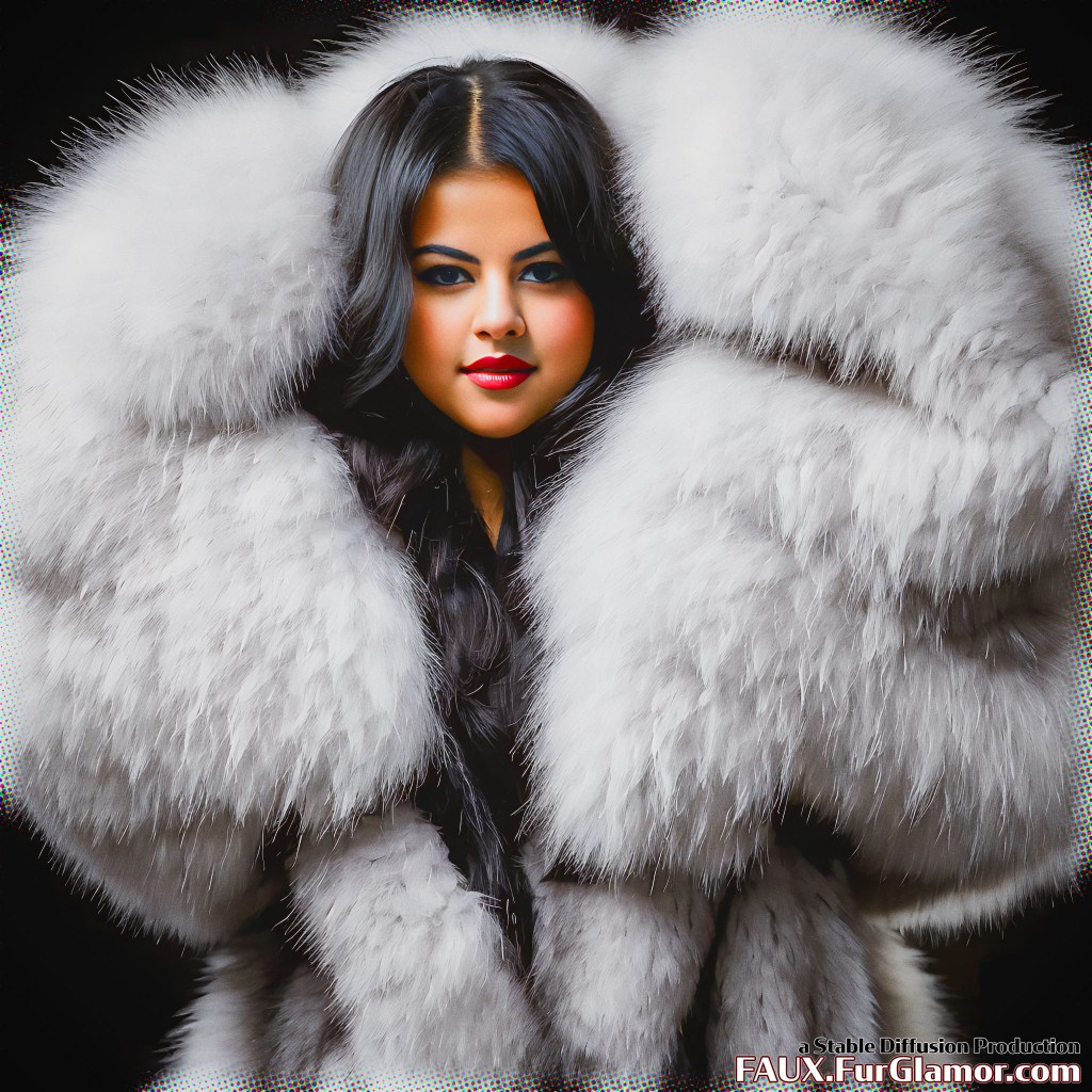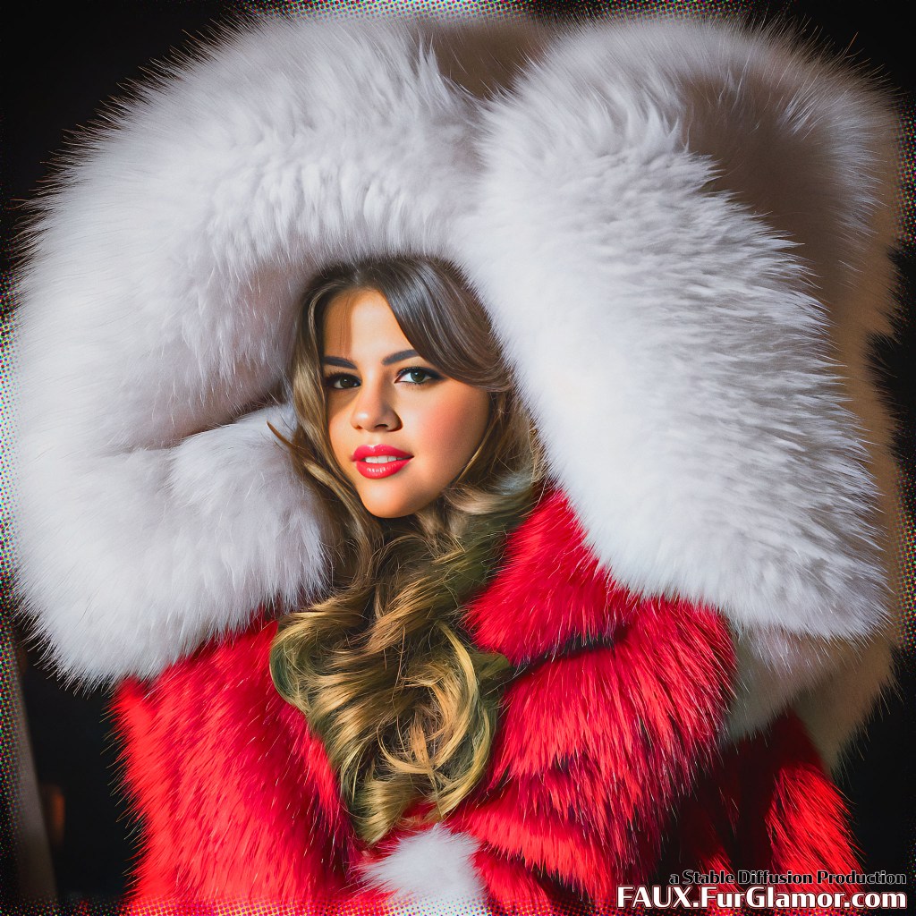 RAW photo, portrait of Selena Gomez in a COLOR fur coat over a silk blouse, on a concert stage in a snowy city at night, mega (bouffant hair)++, (high detailed skin)+, 8k uhd, dslr, concert lighting, backlighting, steam, high quality, film grain, Fujifilm XT3, (sfw)+, singing,