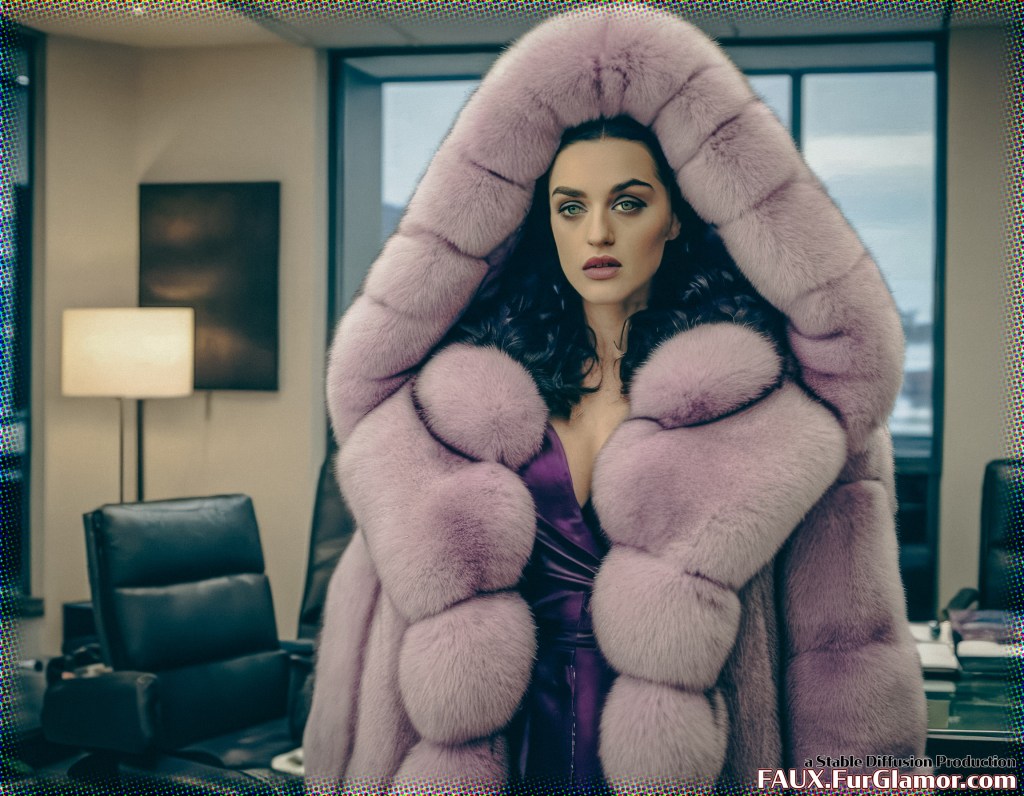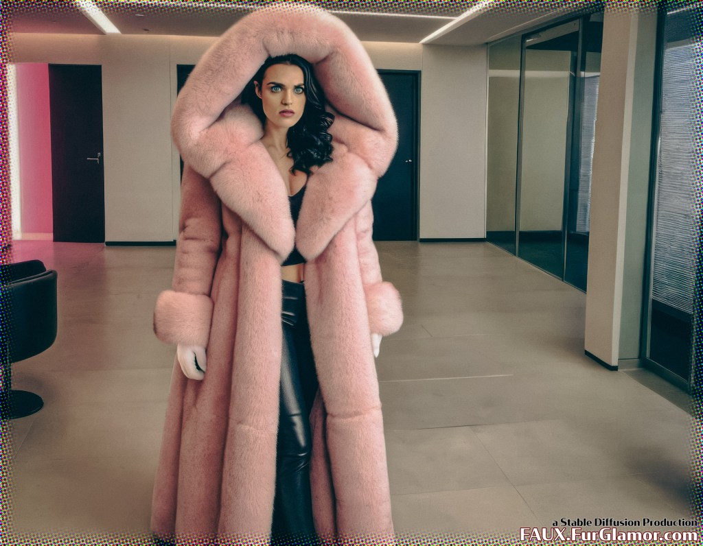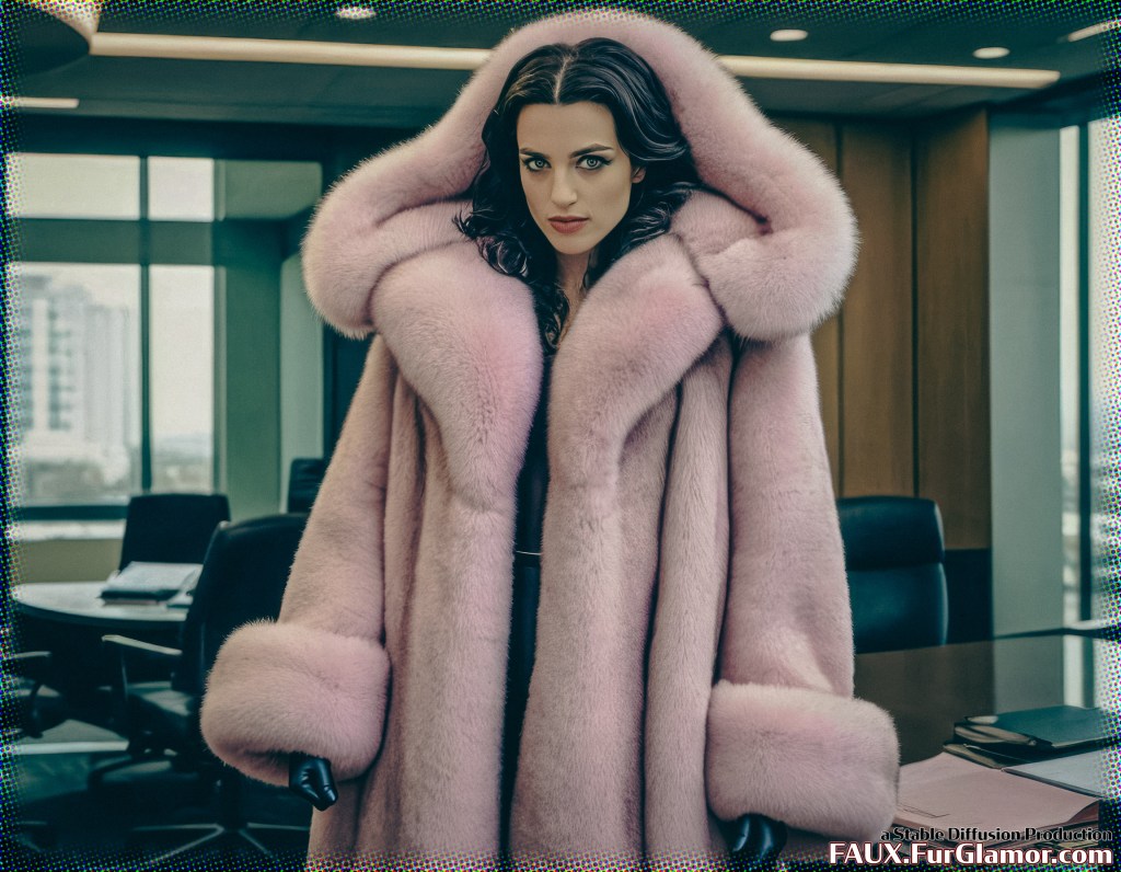Prompt: photo of Katie McGrath wearing an enormous red fur coat, in a modern executive office, (huge fur coat:1.1), large breasts, (big black hair, pale skin, goth makeup:1.15), hood up, leather bodysuit, dynamic pose, fur coats everywhere, high tech